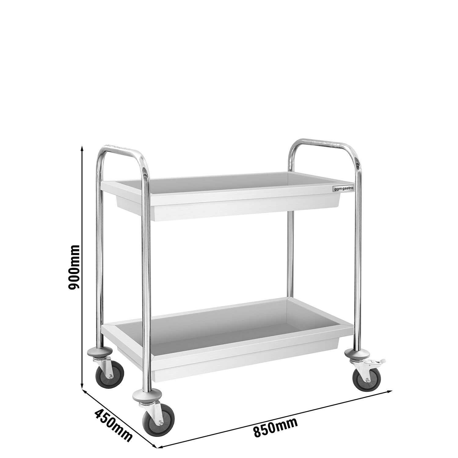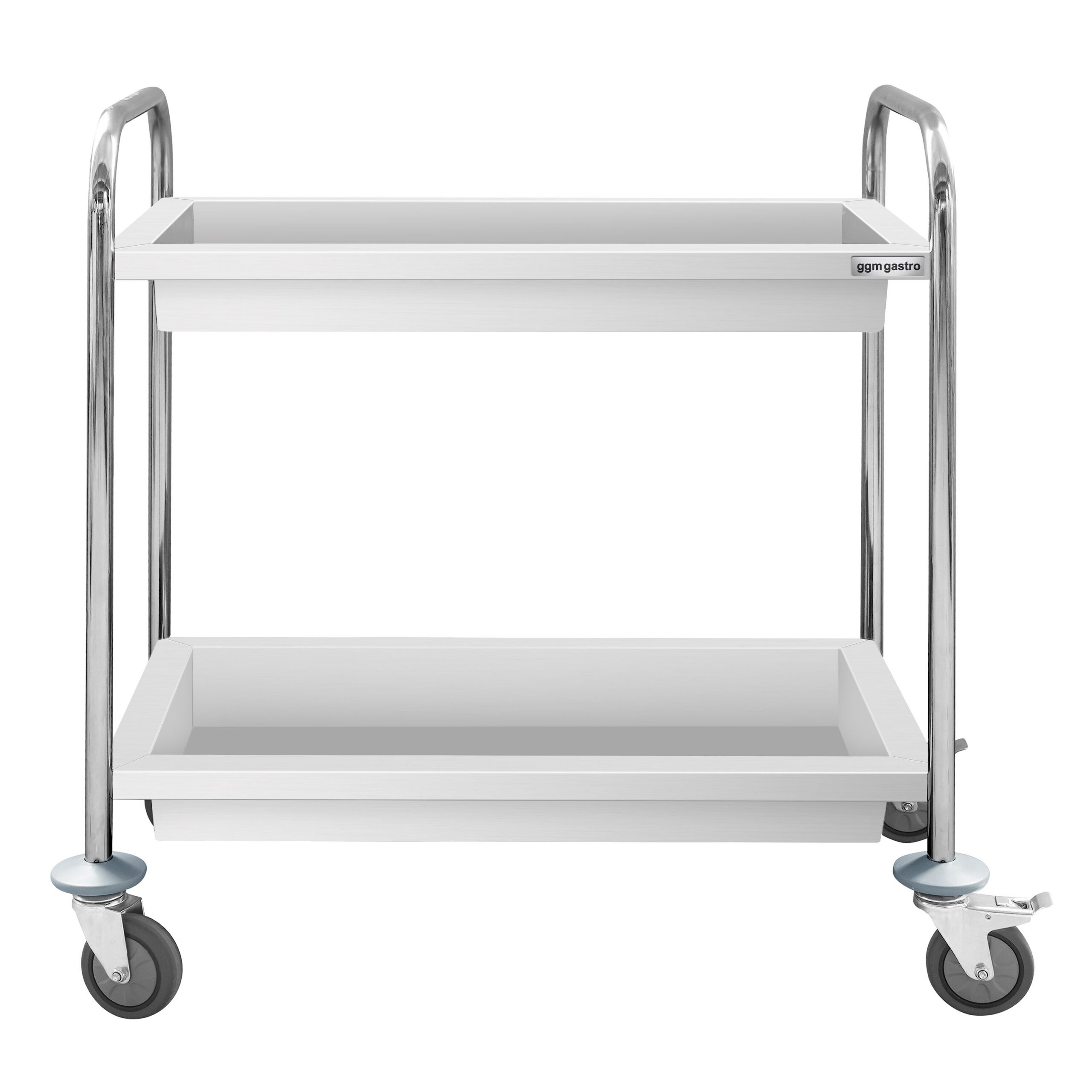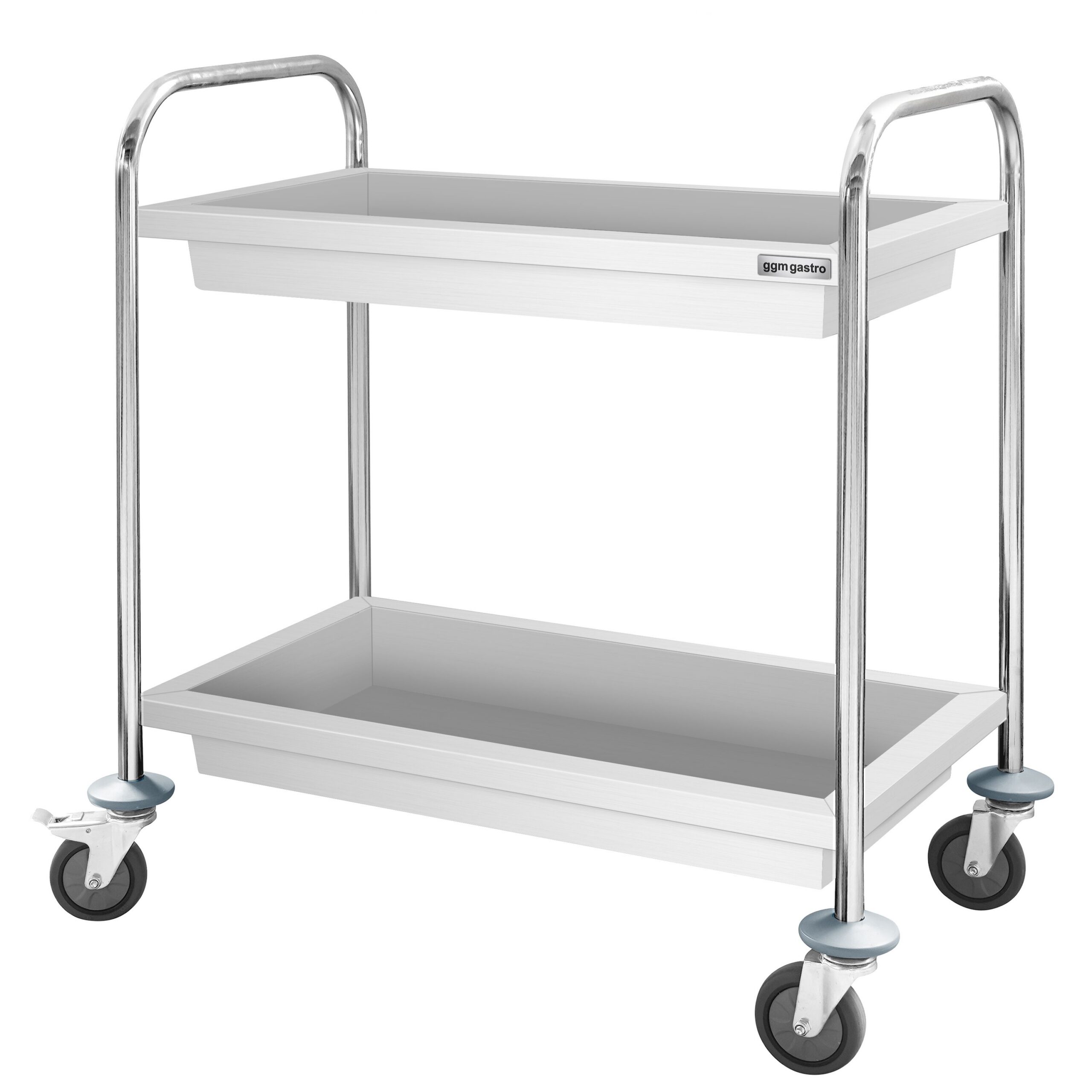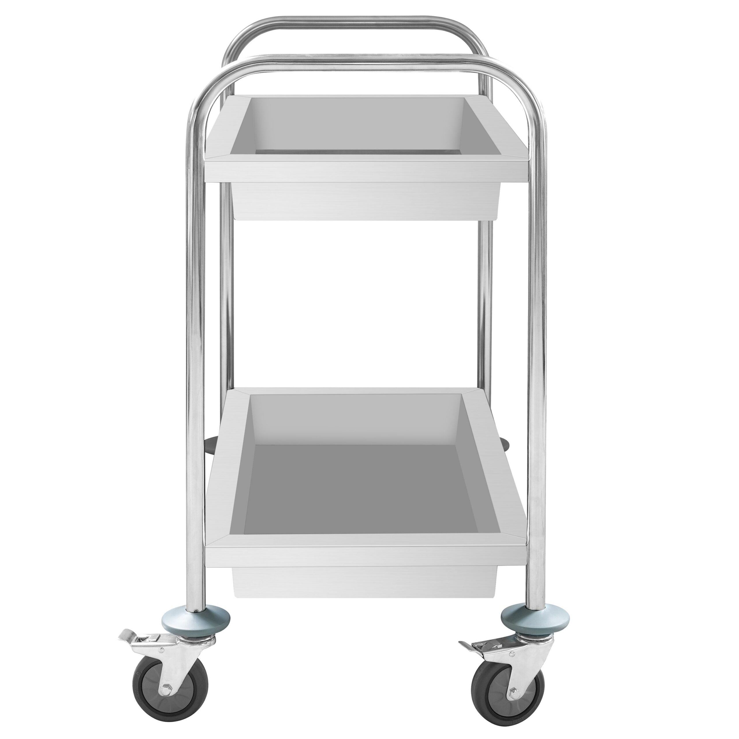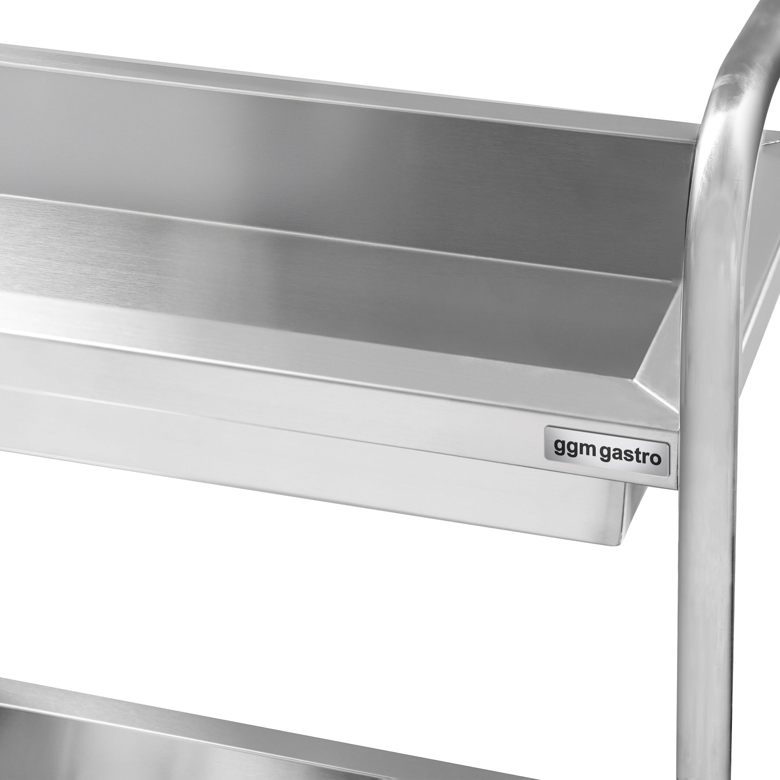 Kvaliteetne ja vastupidav roostevabast terasest serveerimiskäru sügavate riiulitega (2tk). Riiulite vahe 43cm. Riiulite all on mürasummutav matt. Käru nurkades plastikust pehmendavad kaitsmed. Kärul on neli pöörlevat ratast, millel kahel on pidurid. Rattad pehmest kummist.