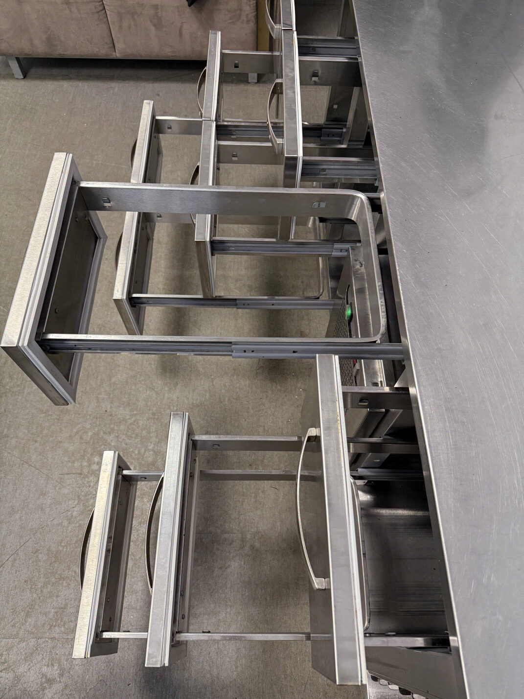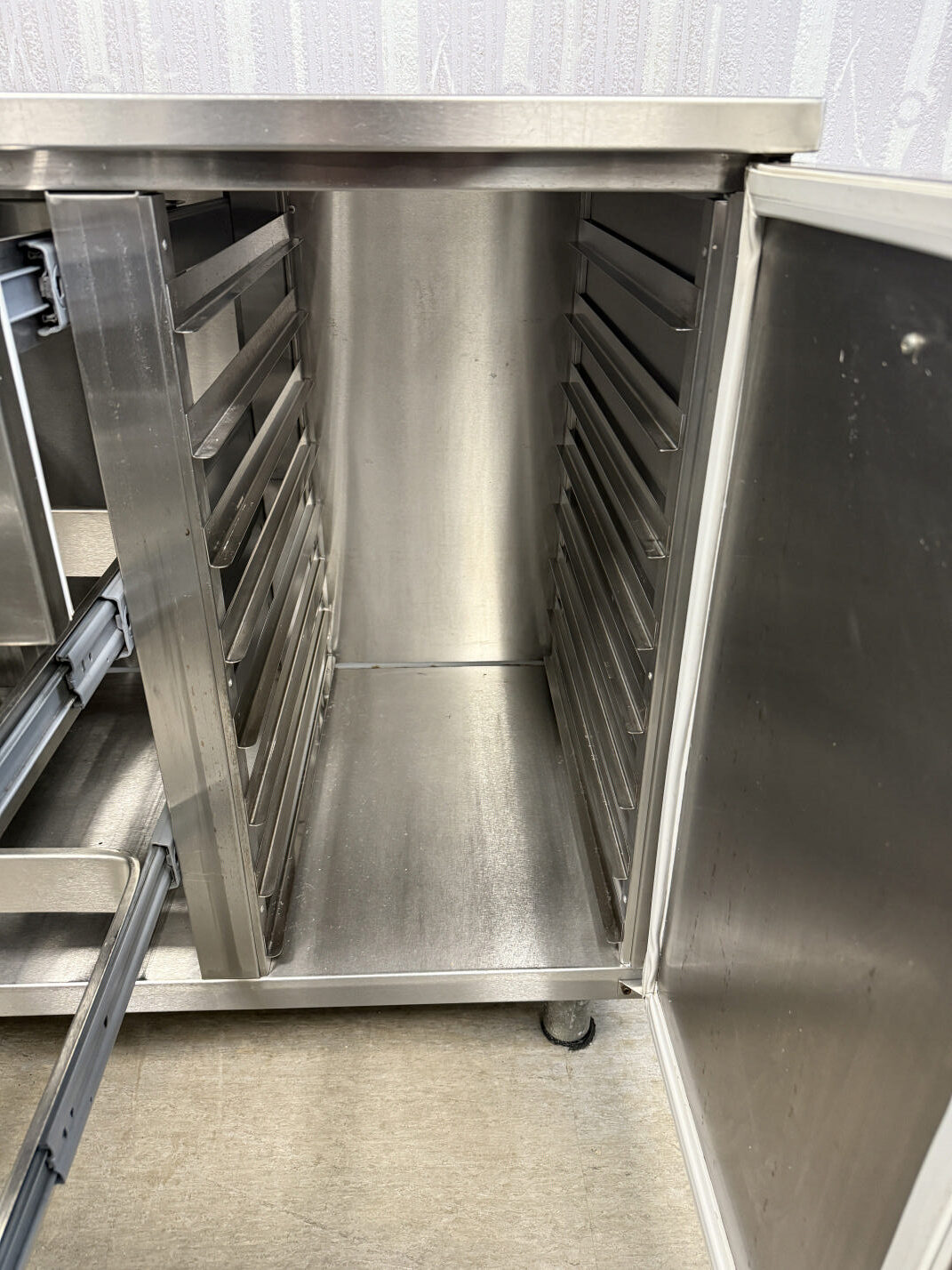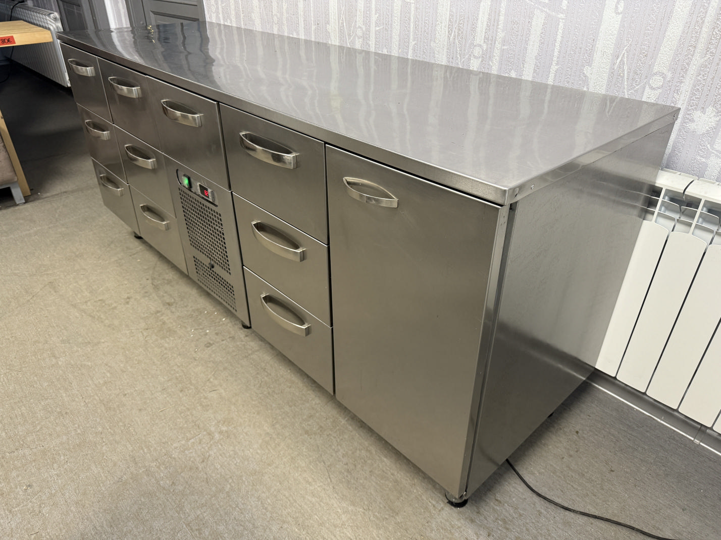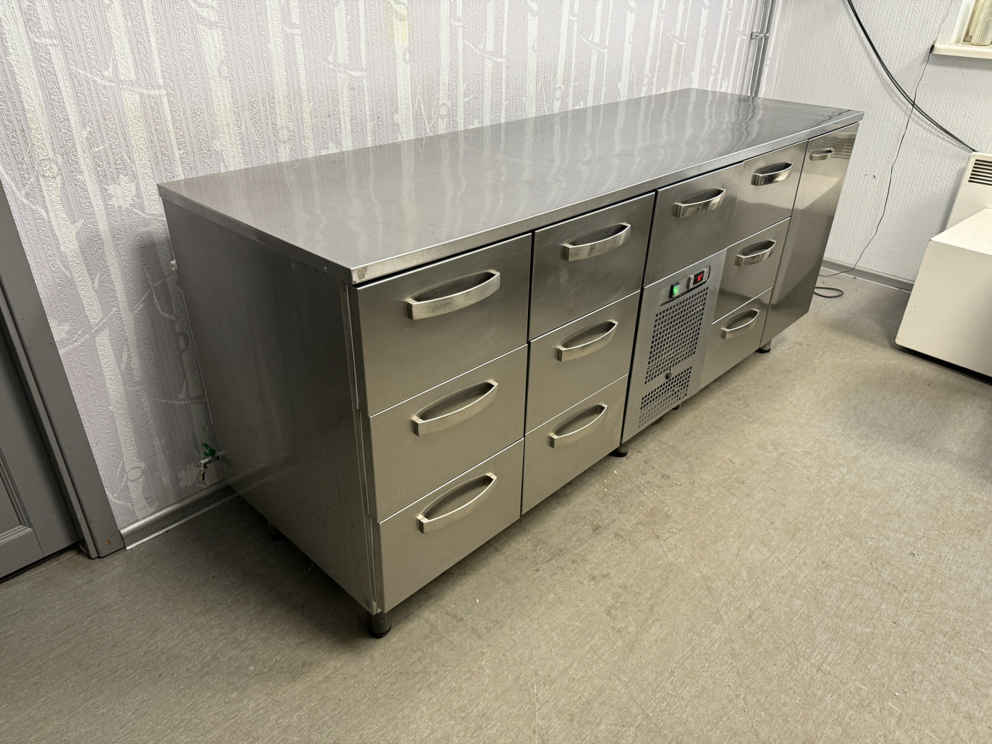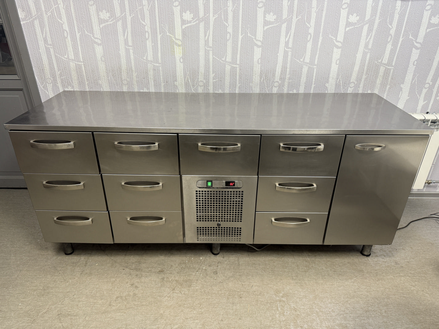 Müüa külmtöölaud 10-sahtliga. Kõik sahtlit mahutavad 10x GN 1/1 150mm nõud. Lisaks paremal pool siinidega kapp, kuhu mahutab 8 GN nõud, siinivahe 8cm. Sahtlid avanevad 110% nii, et GN-nõusid on sahtlitesse mugav asetada. Sahtli liuguritel on tagasitõmbe lukustussüsteemid. Sahtli liugurid on vajadusel kiirvahetatavad. Tihendid on korralikud.