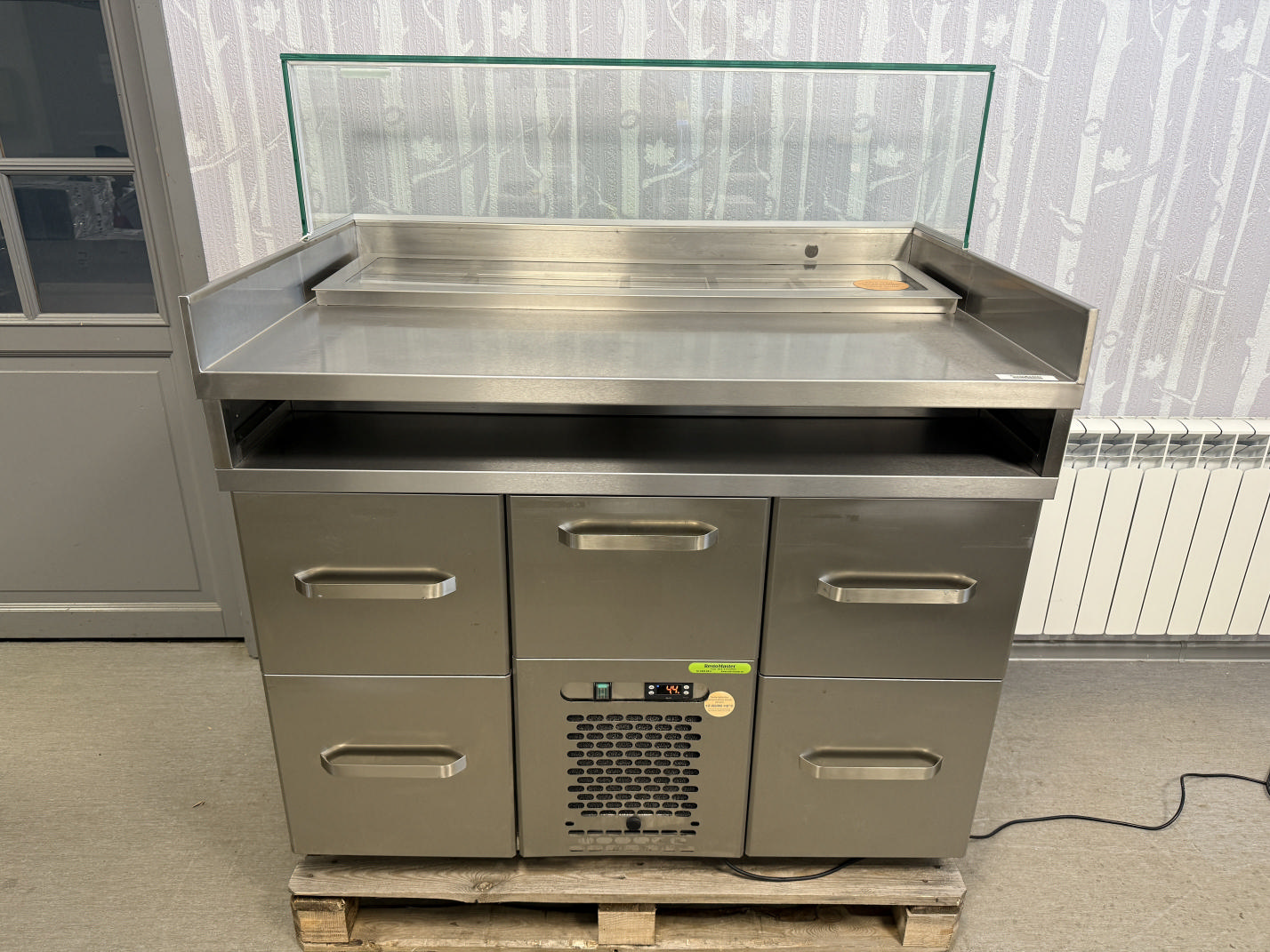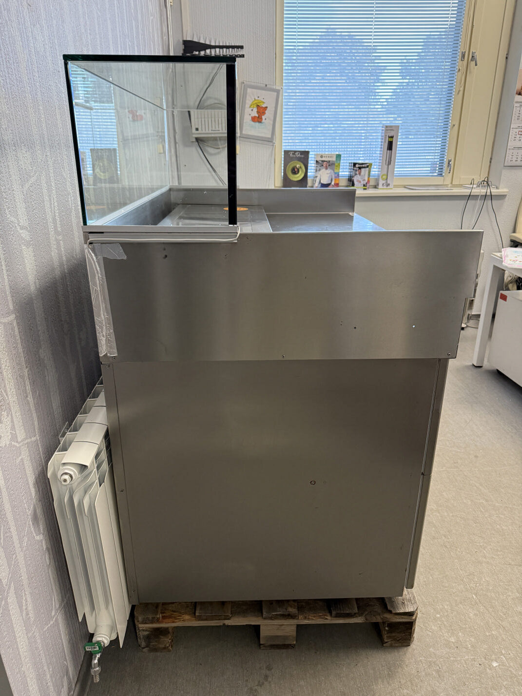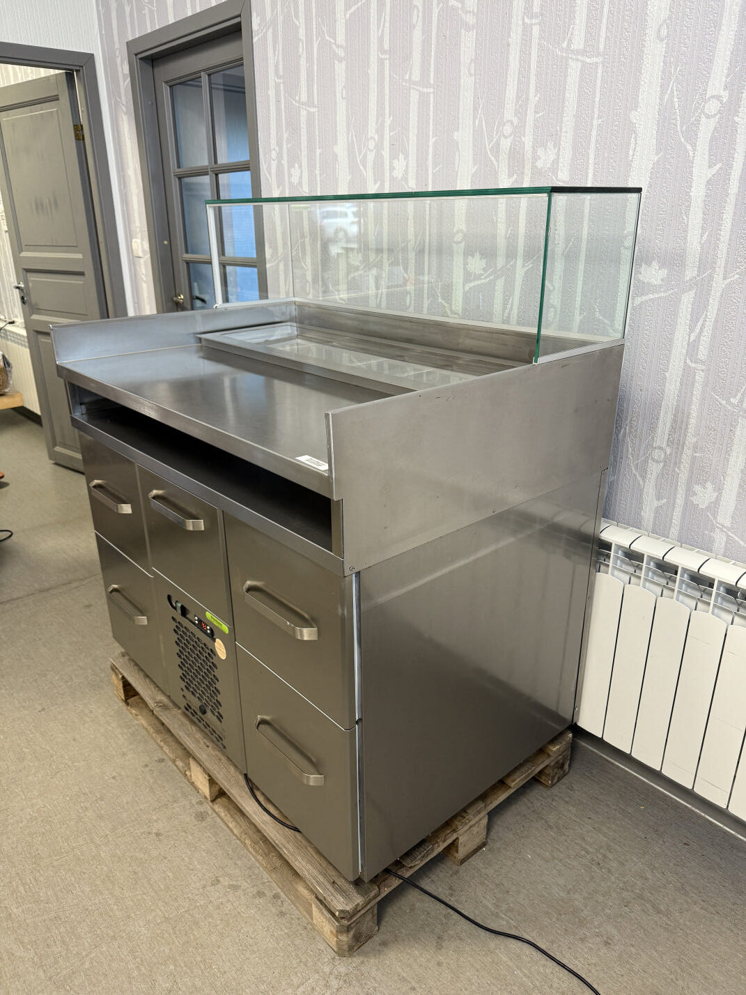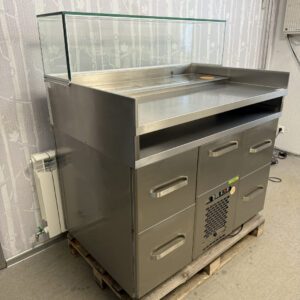 Müüa kompaktne külmtöölaud / komplekteerimis laud mis sobib nii wrapi, pitsa kui muude asjade kiireks komplekteerimiseks ja väljastamiseks. Saab kasutada otse väljastus letis. Ees klaasist pritsmekaitse mõõduga 120x30x30cm paksus 1,2cm. Tööpinnas sees külmsüvend mõõduga 104x30cm ja sügavusega 10cm / 15cm. Süvendil peal kaas et oleks lihtsam opreerida ja kõik Gnid avatavad ühe liigutusega. Töötamiseks jääb vaba tööpinda 116x41cm. Laual kõik kolm külge tõstetud äärtega 10cm. Töötasapinna all ava või riiul mõõduga 114x25x10cm.