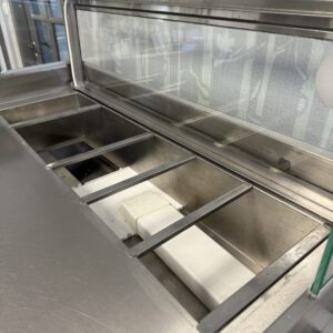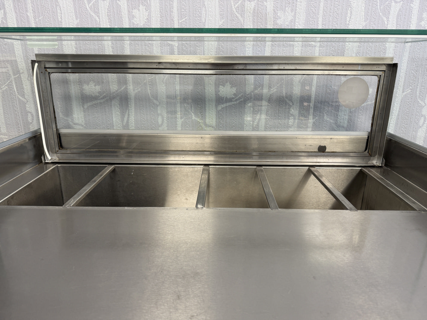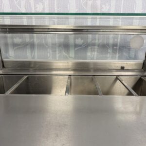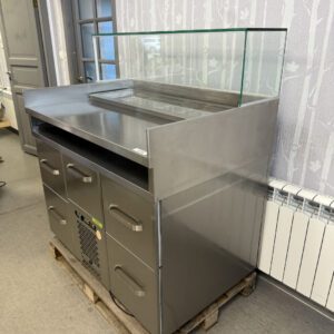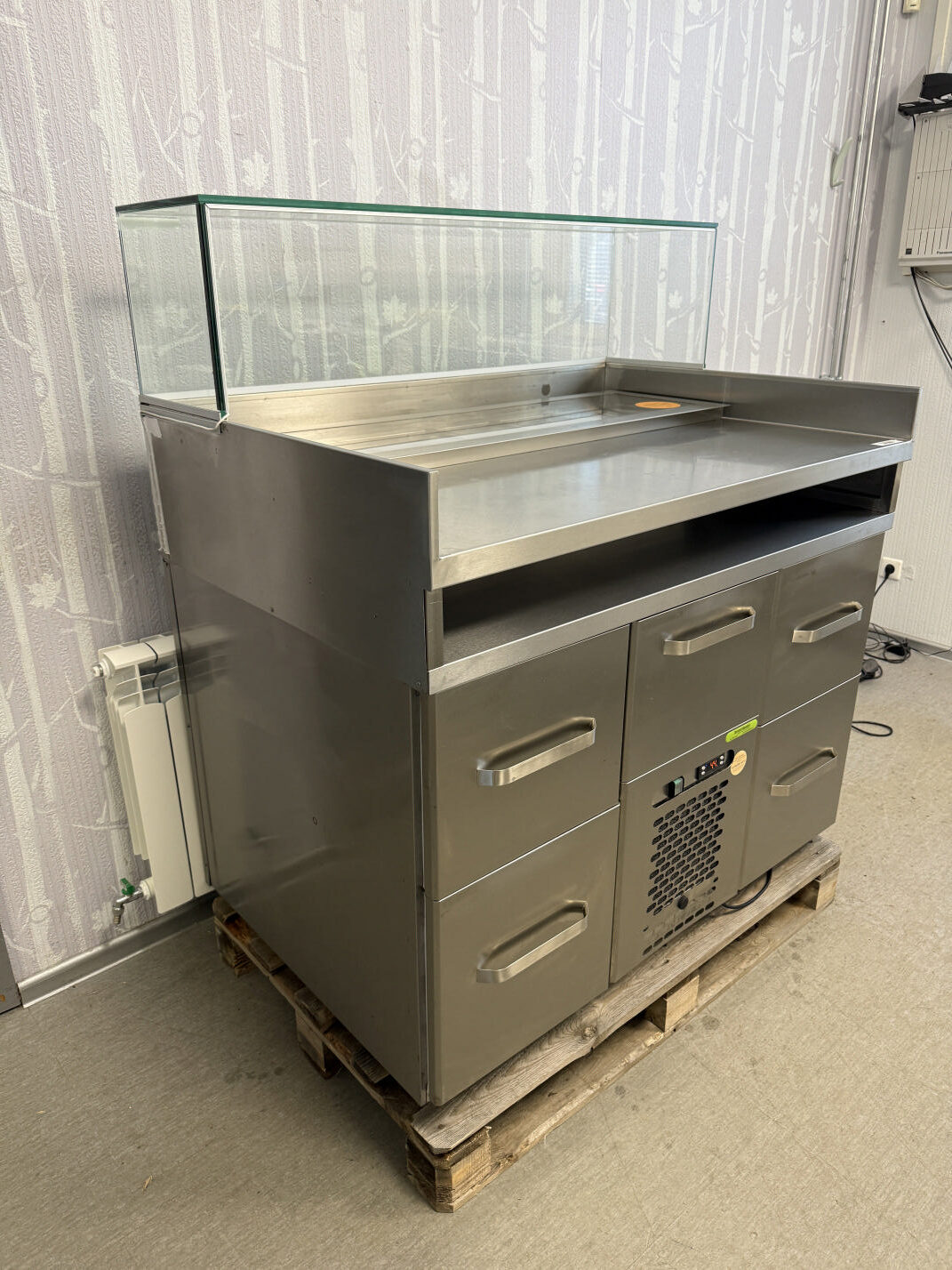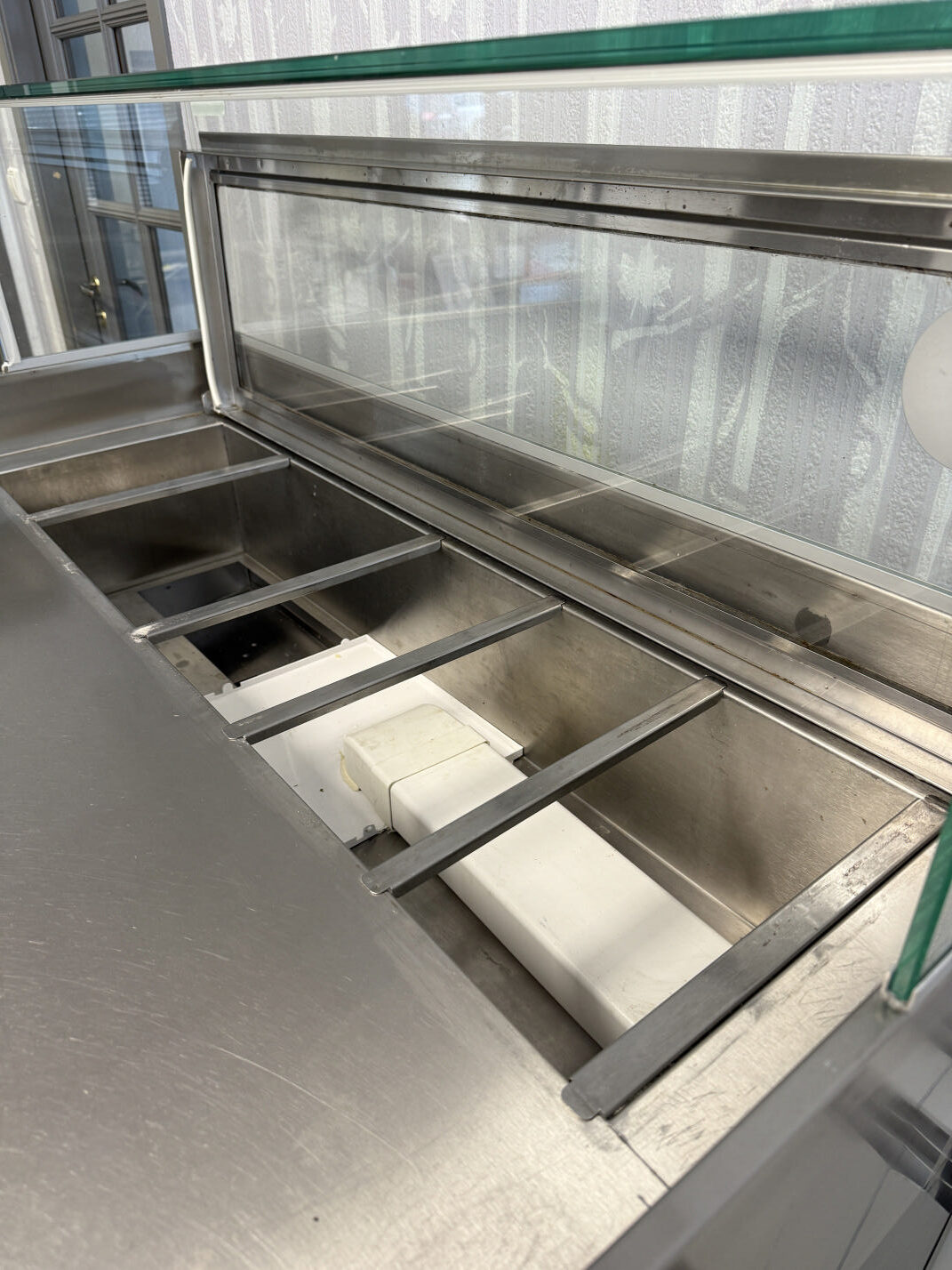 Müüa kompaktne külmtöölaud / komplekteerimis laud mis sobib nii wrapi, pitsa kui muude asjade kiireks komplekteerimiseks ja väljastamiseks. Saab kasutada otse väljastus letis. Ees klaasist pritsmekaitse mõõduga 120x30x30cm paksus 1,2cm. Tööpinnas sees külmsüvend mõõduga 104x30cm ja sügavusega 10cm / 15cm. Süvendil peal kaas et oleks lihtsam opreerida ja kõik Gnid avatavad ühe liigutusega. Töötamiseks jääb vaba tööpinda 116x41cm. Laual kõik kolm külge tõstetud äärtega 10cm. Töötasapinna all ava või riiul mõõduga 114x25x10cm.