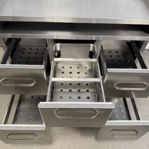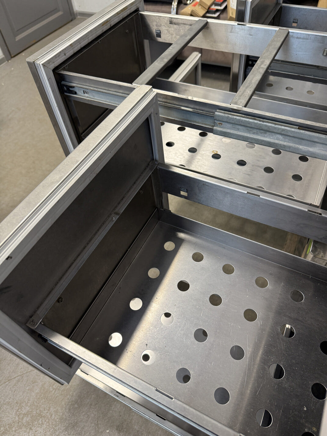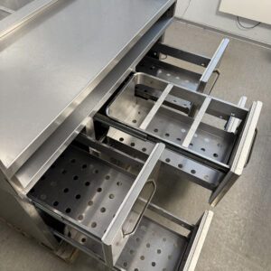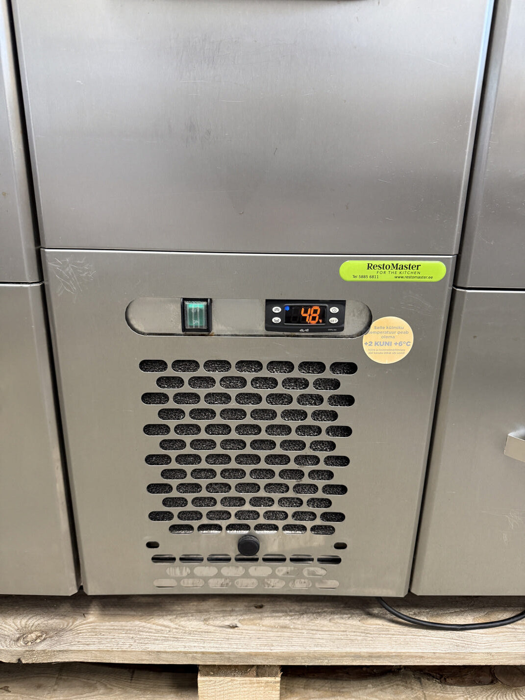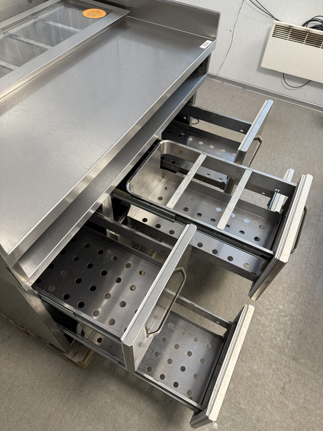 5 suurt sahtlit, kus kõigil täis põhjad. Sahtlid täispõhjaga ja mahukad. Neli sahtlit mahutavad 4x GN 1/1 150mm ja 1x GN 1/1 200mm GN-nõud. Kõik sahtlid on jahutusega. Kõikide sahtlite tihendid väga korralikud.