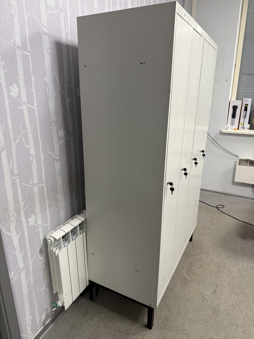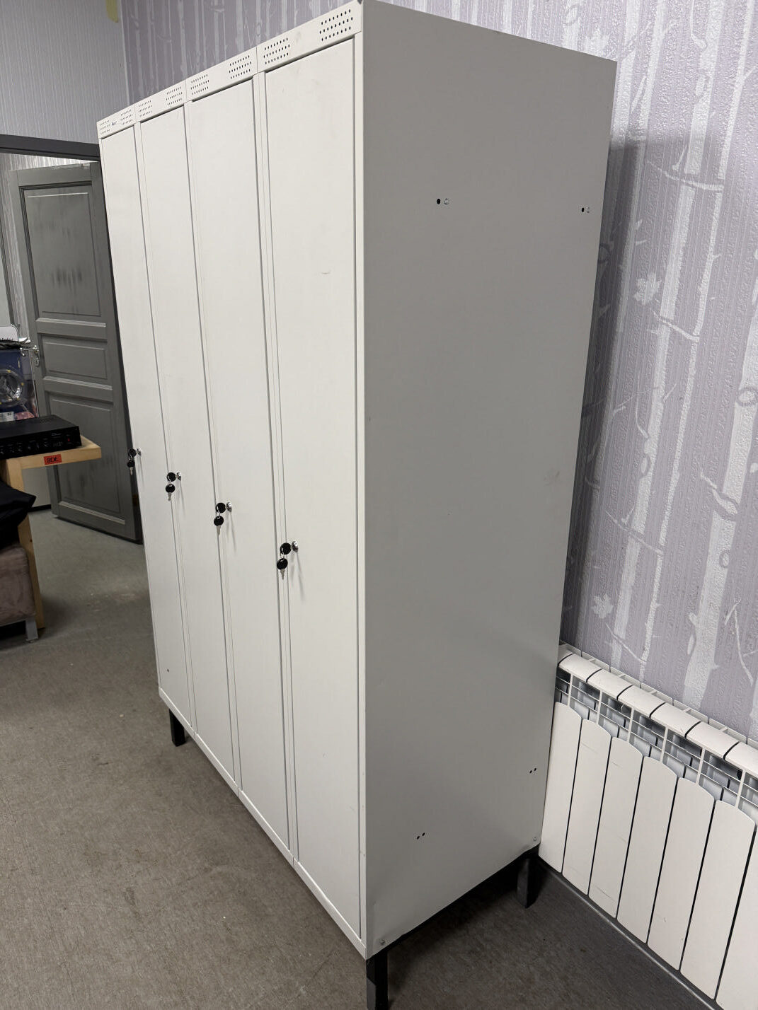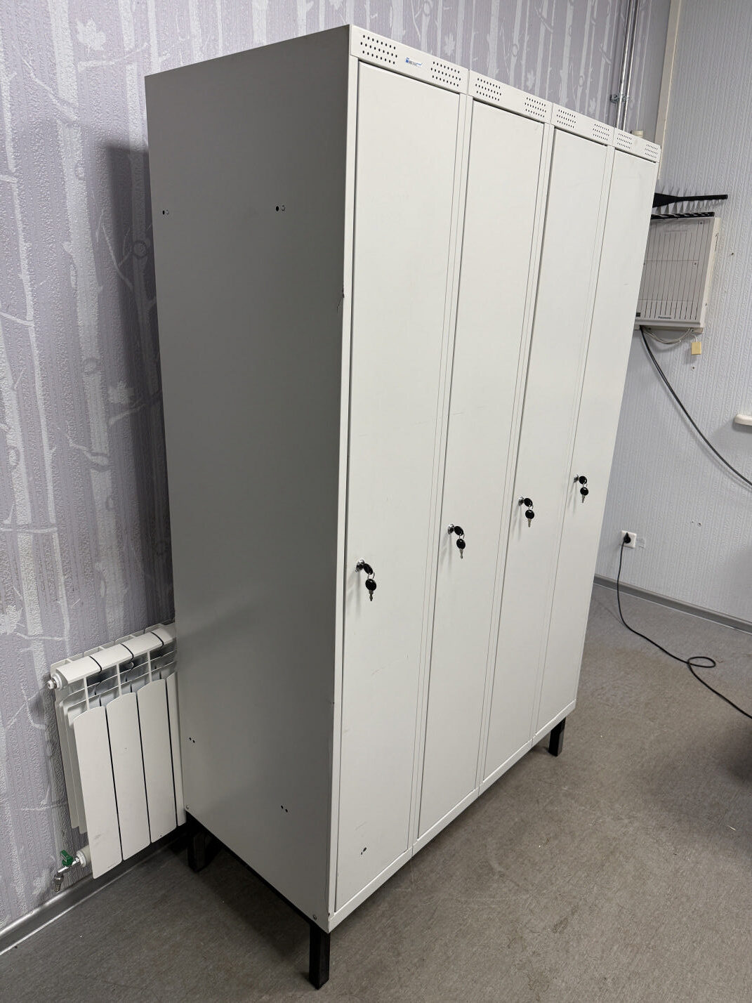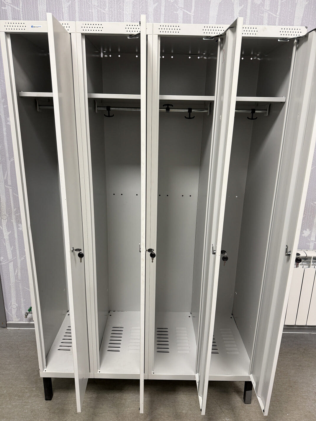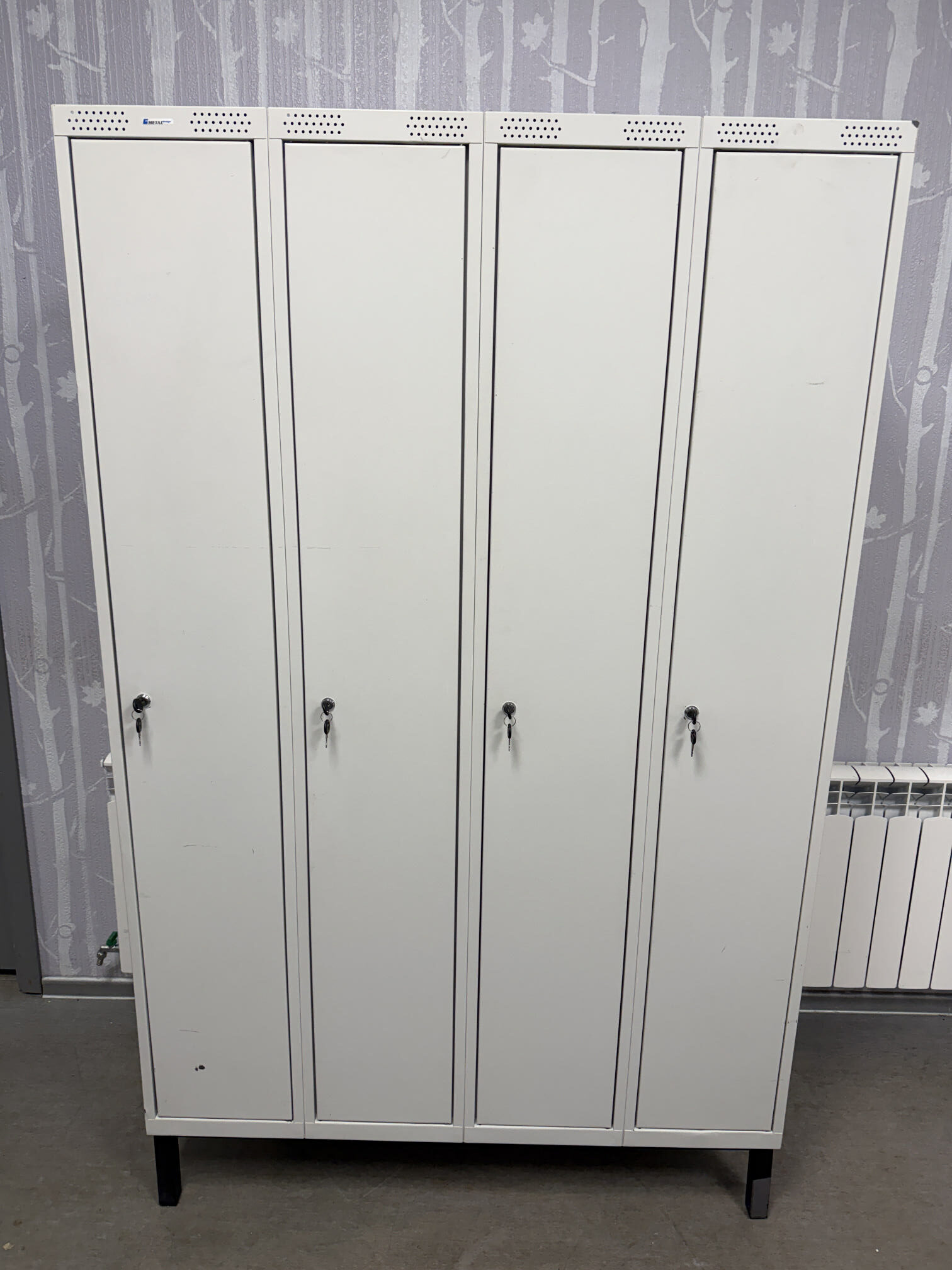 Müüa kasutatud metallist riidekapp. Kapid tugevad ja vastupidavad. Kapi korpus on kokku keevitatud ja pulbervärvitud. Mahutab kokku 4 töölist. Igas kapis mütsiriiul ja riputustoru. Riiuli mõõdud on 30x44cm ja vahe 25cm. Ventilatsiooniavad paiknevad kapi põhjas ning uste üla- ja alaosas. Uksed on võtmega lukustatavad, ühe ukse komplekti kuulub 2 võtit. Kapil on all reguleeritavad jalad. Ühe kapi sisemõõt on 30x53x170cm. Kapi välismõõt 120x55x195cm.