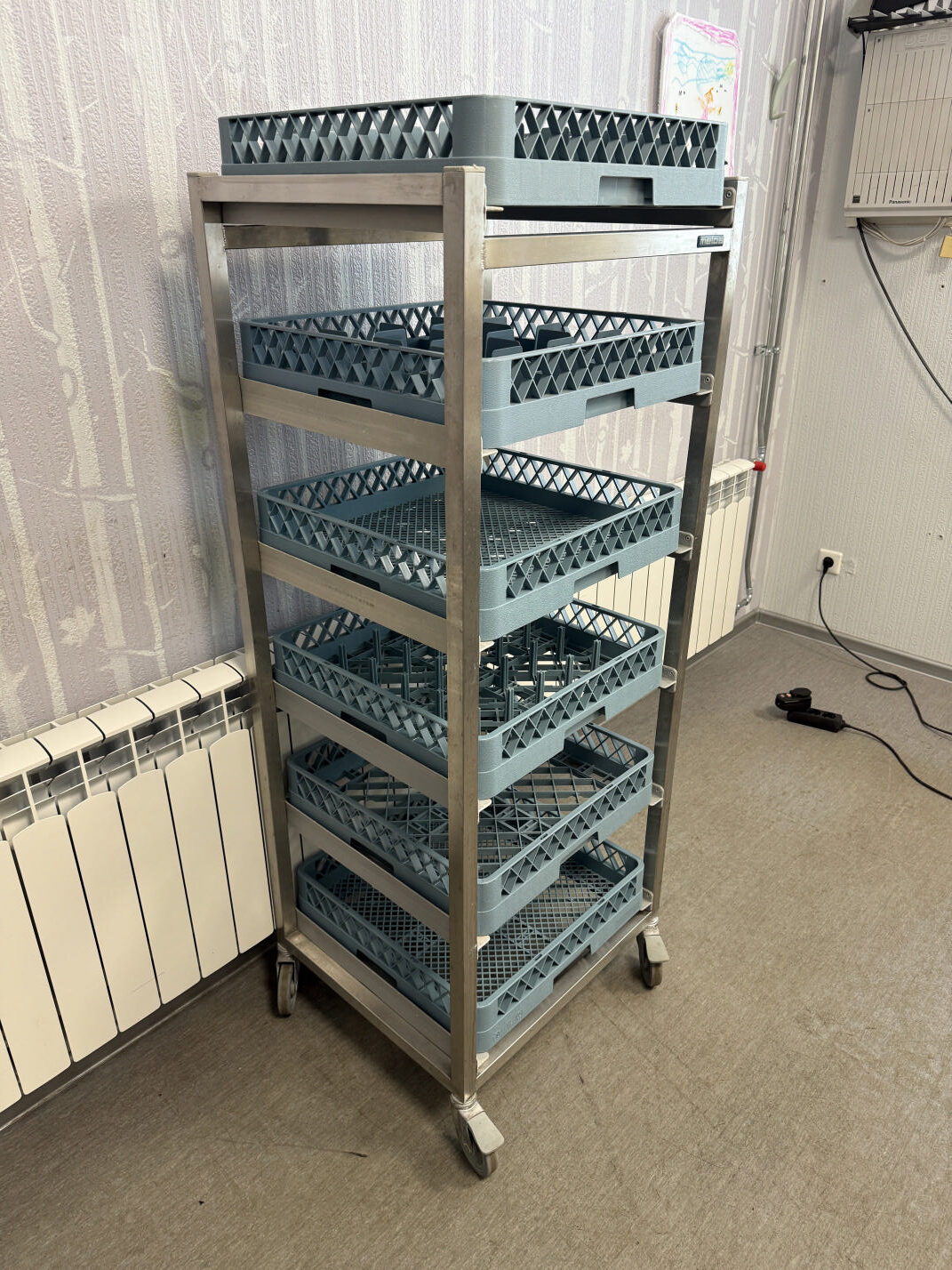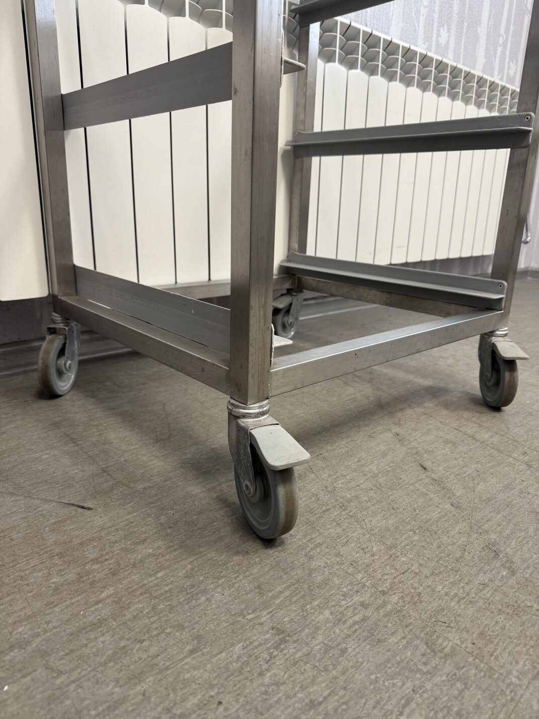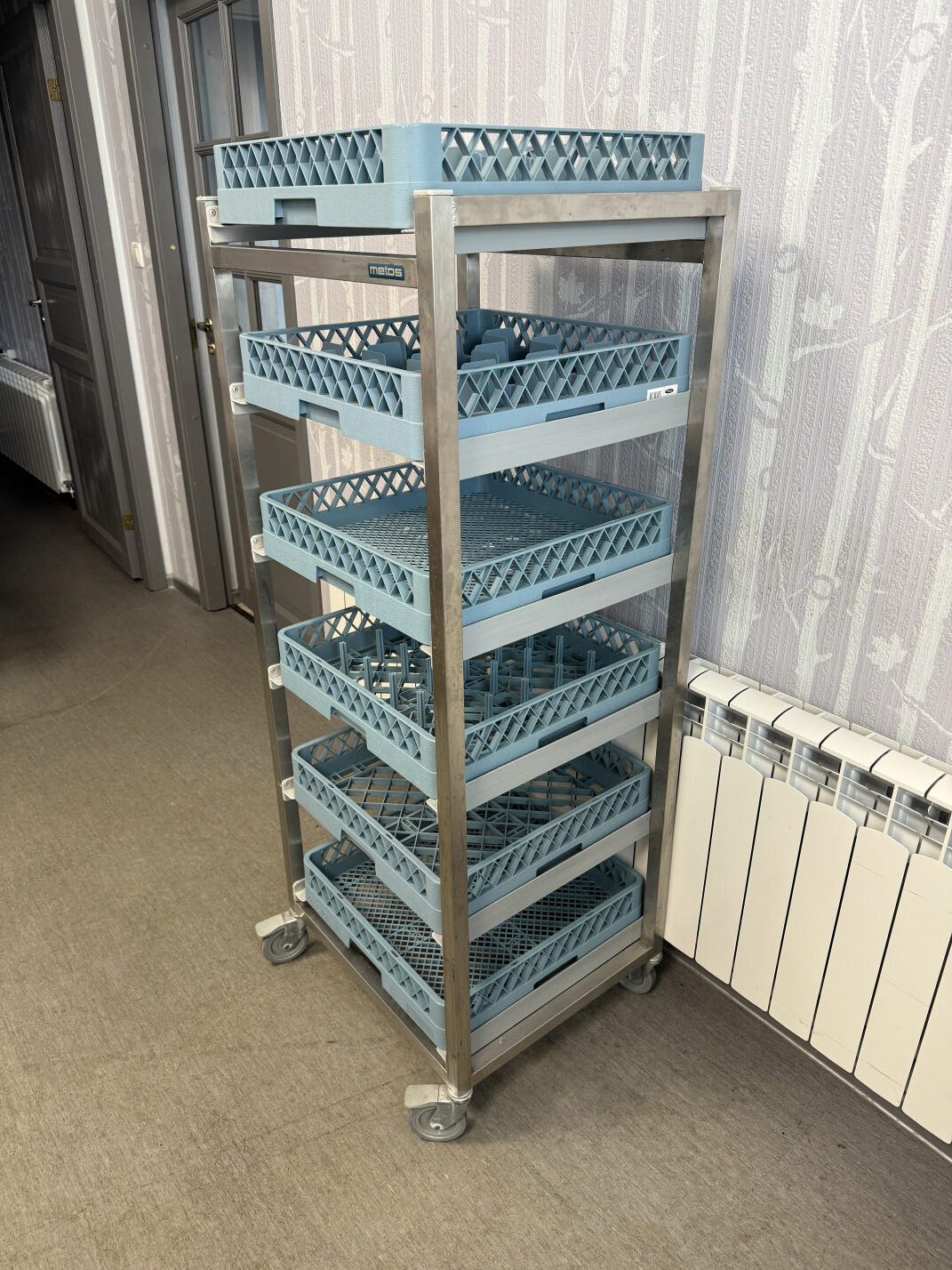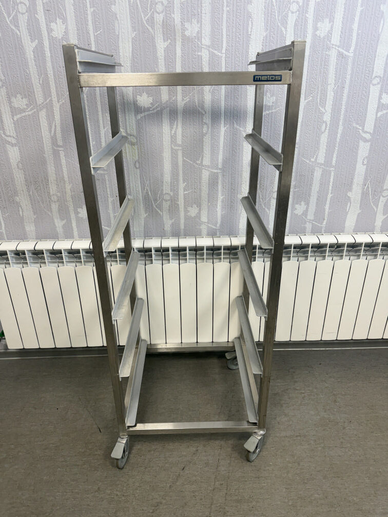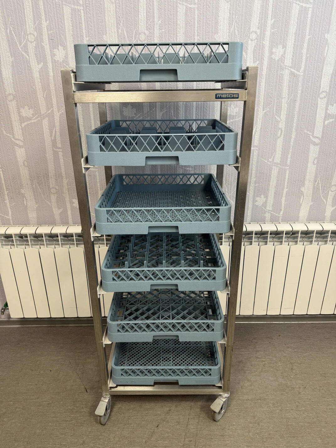 Müüa uueväärne ratastel nõudepesukorvide dogi Metos. Raam valmistatud roostevabast terasest. Mahutab 6 korvi. Siinivahe on 24cm. All 4 pöörlevat ratast, millest kahel on pidurid. Rattad liiguvad väga sujuvalt. Üldmõõdud 58x51x147cm.