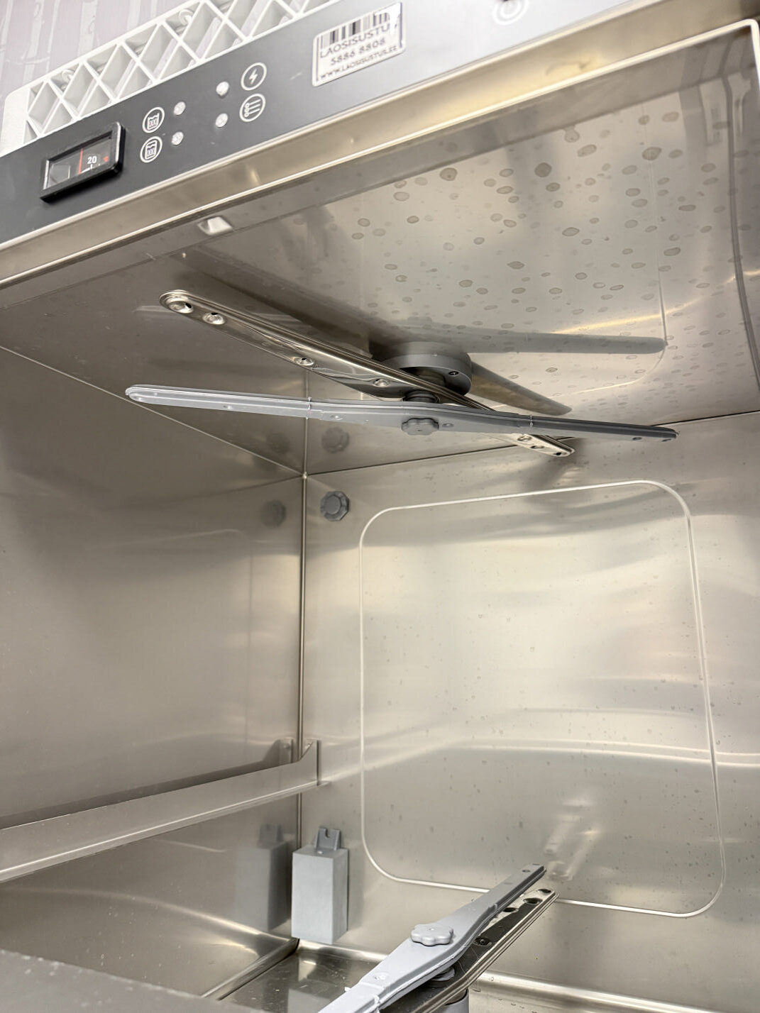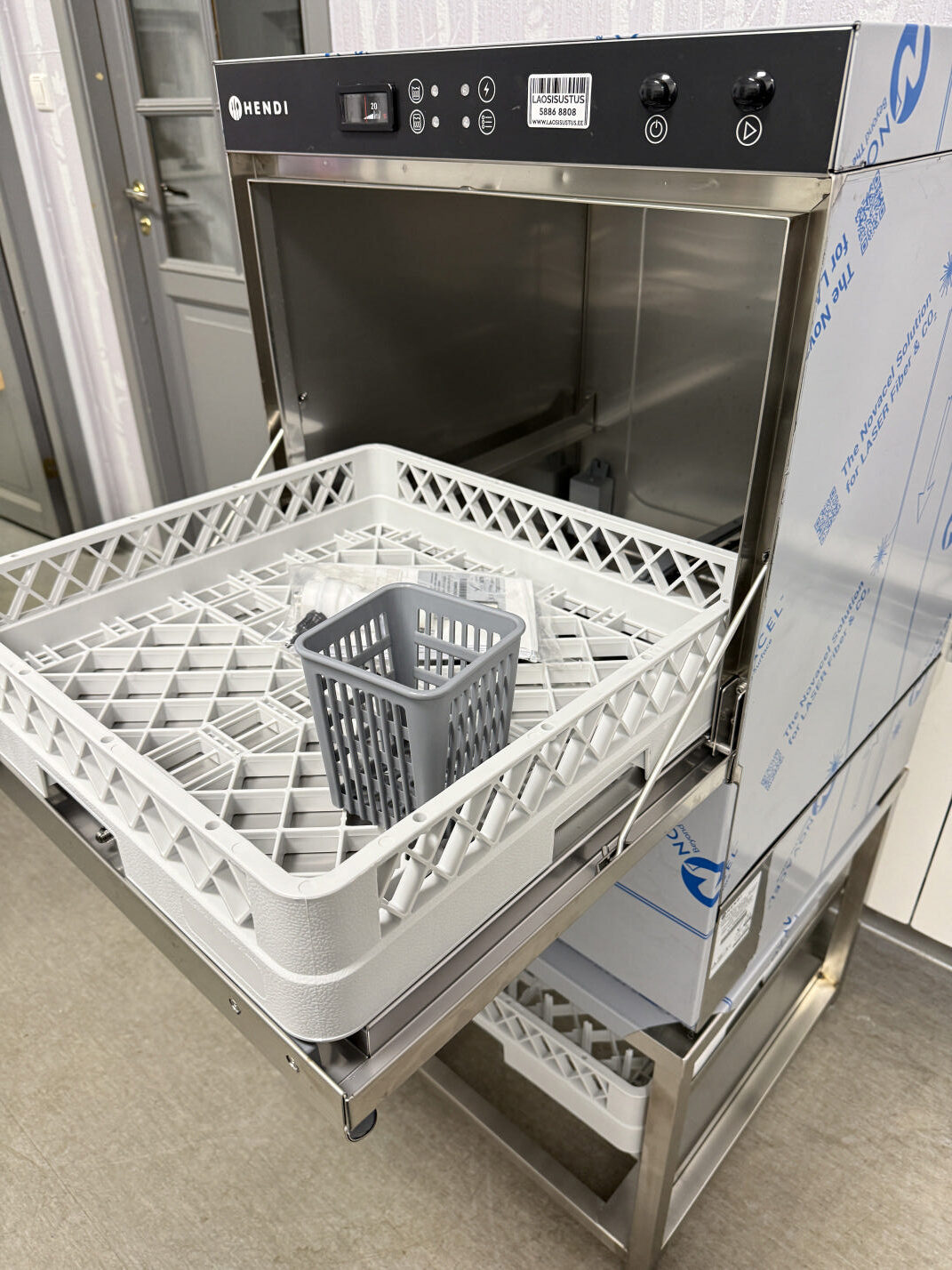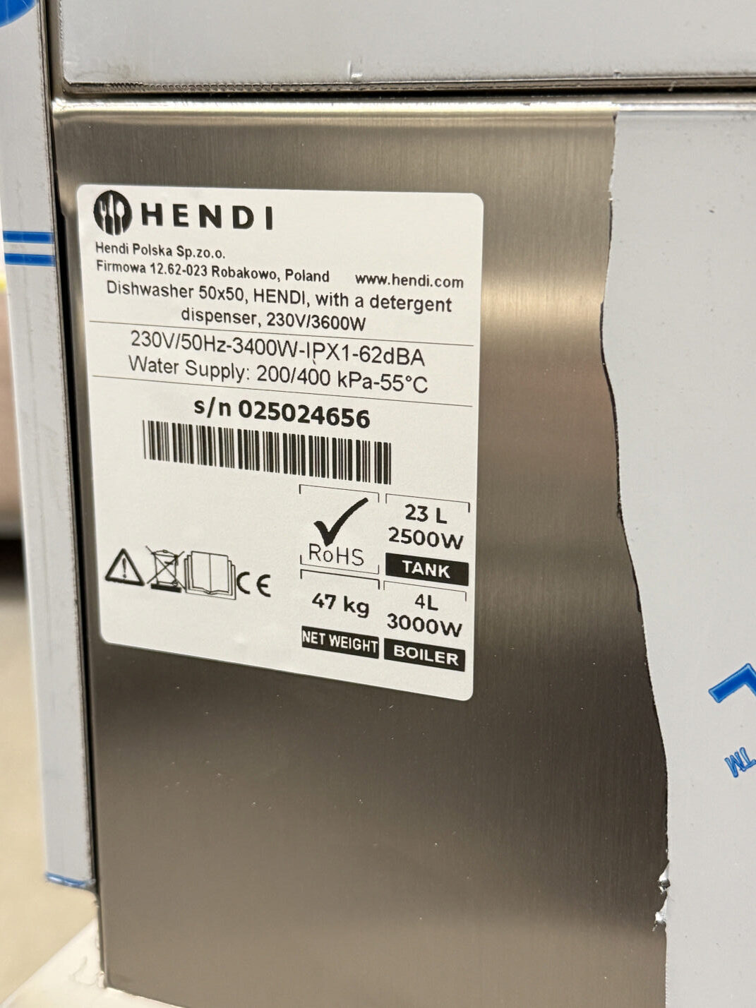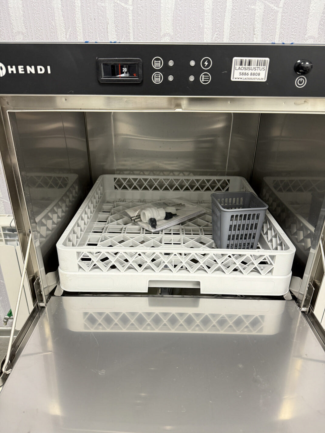 Uus nõudepesumasin Hendi. Lihtne juhtida, hooldada ja puhastada. Mõeldud klaasnõude, tasside, kruuside, taldrikute, söögiriistade ja kandikute pesemiseks. Elektromehhaaniline juhtimine. Roostevabast terasest korpus AISI 304. Plastikust pesukäpad ja roostevabast terasest loputustiivikud. Ülaosas statsionaarsed pesutiivikud, pöörlevad loputustiivikud. Tugev topeltuks.