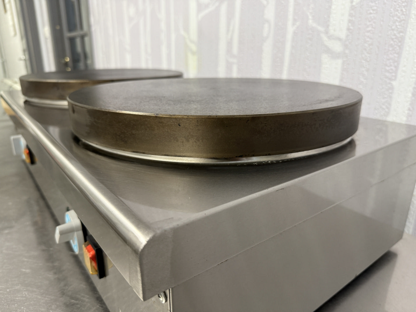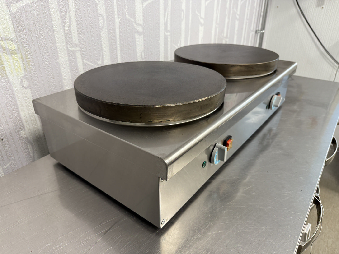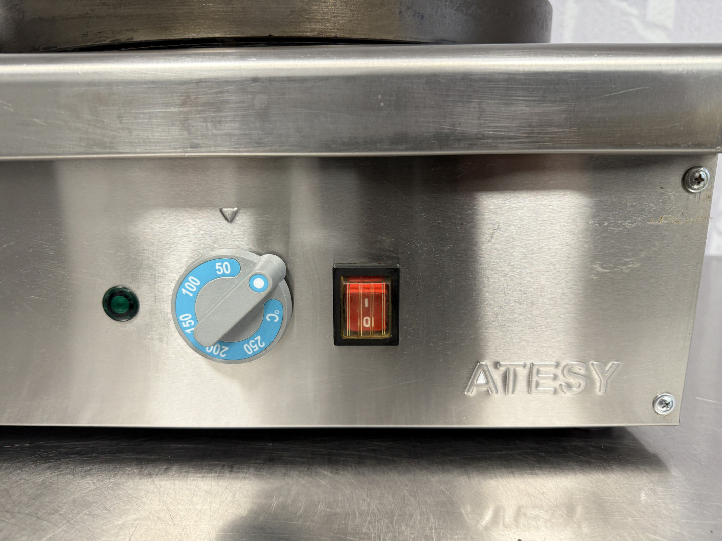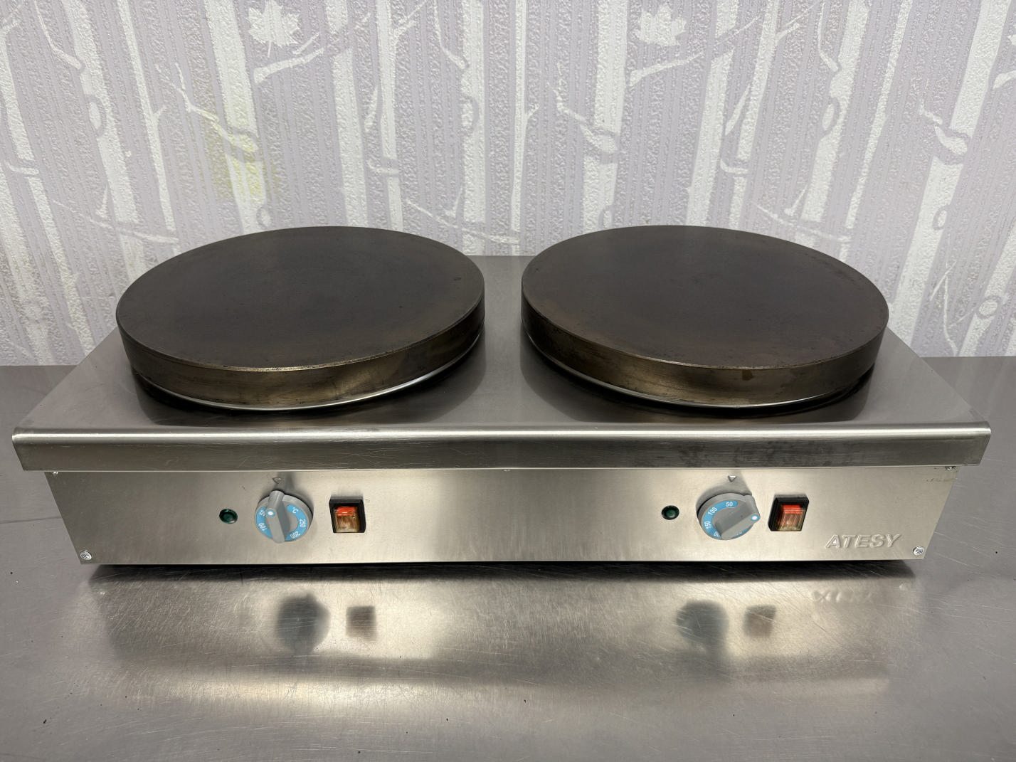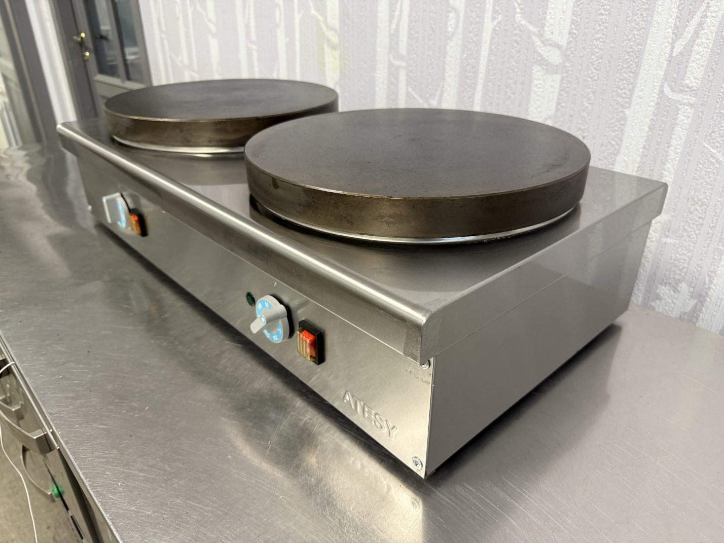 Müüa pannkoogi pann ATESY. Korpus valmistatud roostevabast terasest. Ühe küpsetuspanni läbimõõt on 36cm. Temperatuuri reguleerimine +50 kuni +250C. Pannkookide tootlikus 60tk / tunnis. Pannkoogi valmimisaeg 2min. 2 eraldi küpsetamis tsooni.