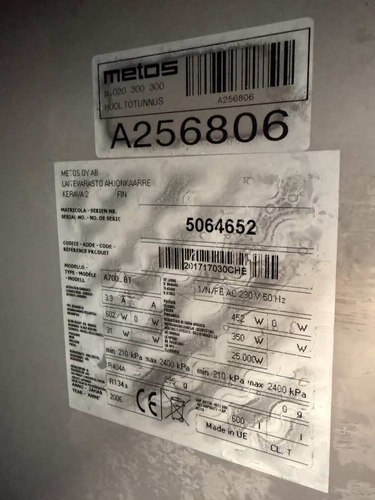 Müüa korralik roostevaba sügavkülmkapp. Tootjaks Metos ja mudel A700L BT. Seisukord ilus ja korralik. BRUTO mahutavus 700L. NETO mahutavus 600 liitrit. Nii väli kui sisepinnad puhtast roostevabast. Ise sulguv vasaku käe uks. Temperatuuri reguleerimine -20°…-10°C. Digitaalne termostaat. Staatiline külmutussüsteem, automaatne sulatus ja aurustus. Sees neli reguleeritavat riiulit mõõduga 53x65cm. Välismõõdud 70x80x205. All reguleeritavad jalad.