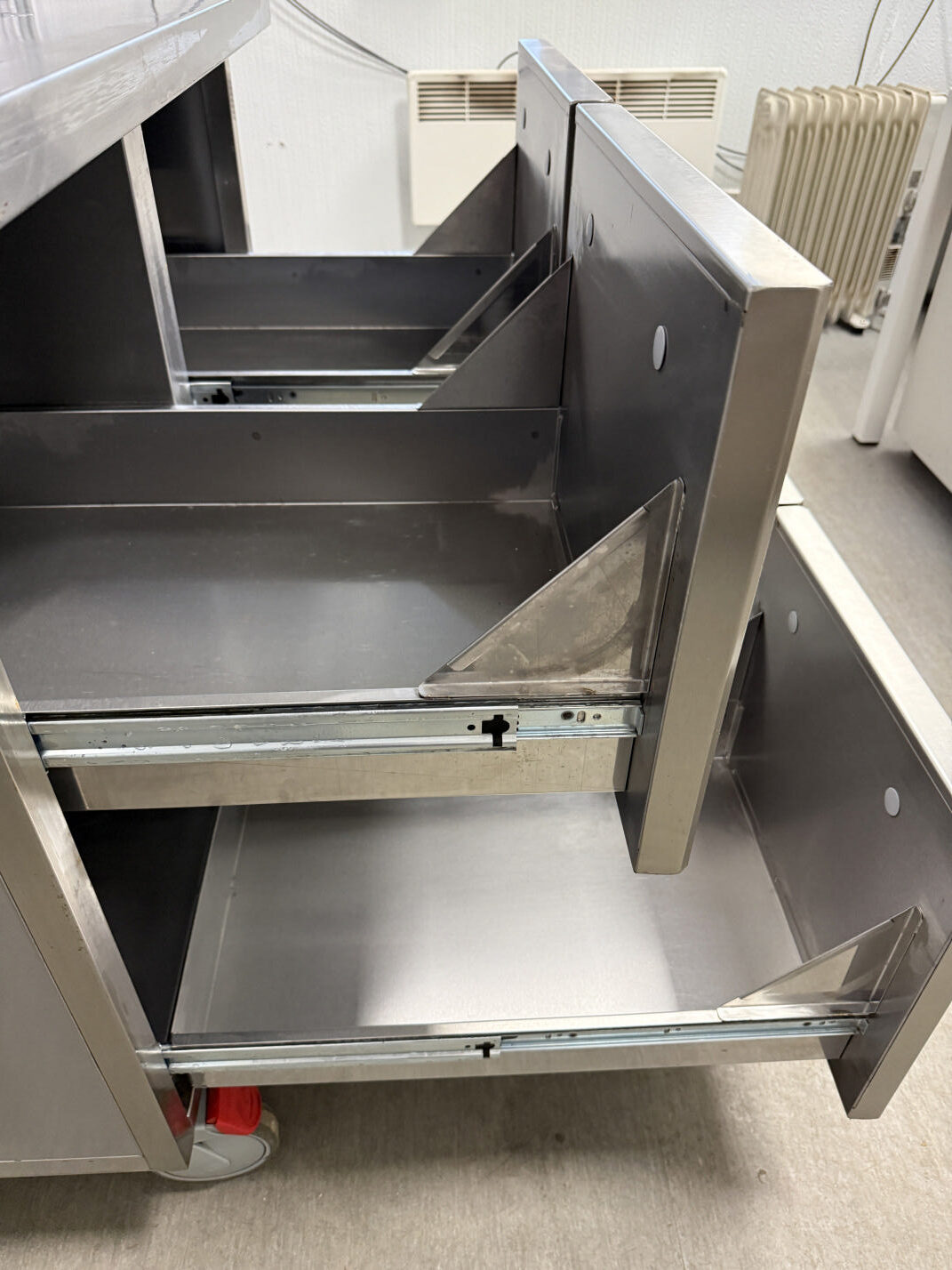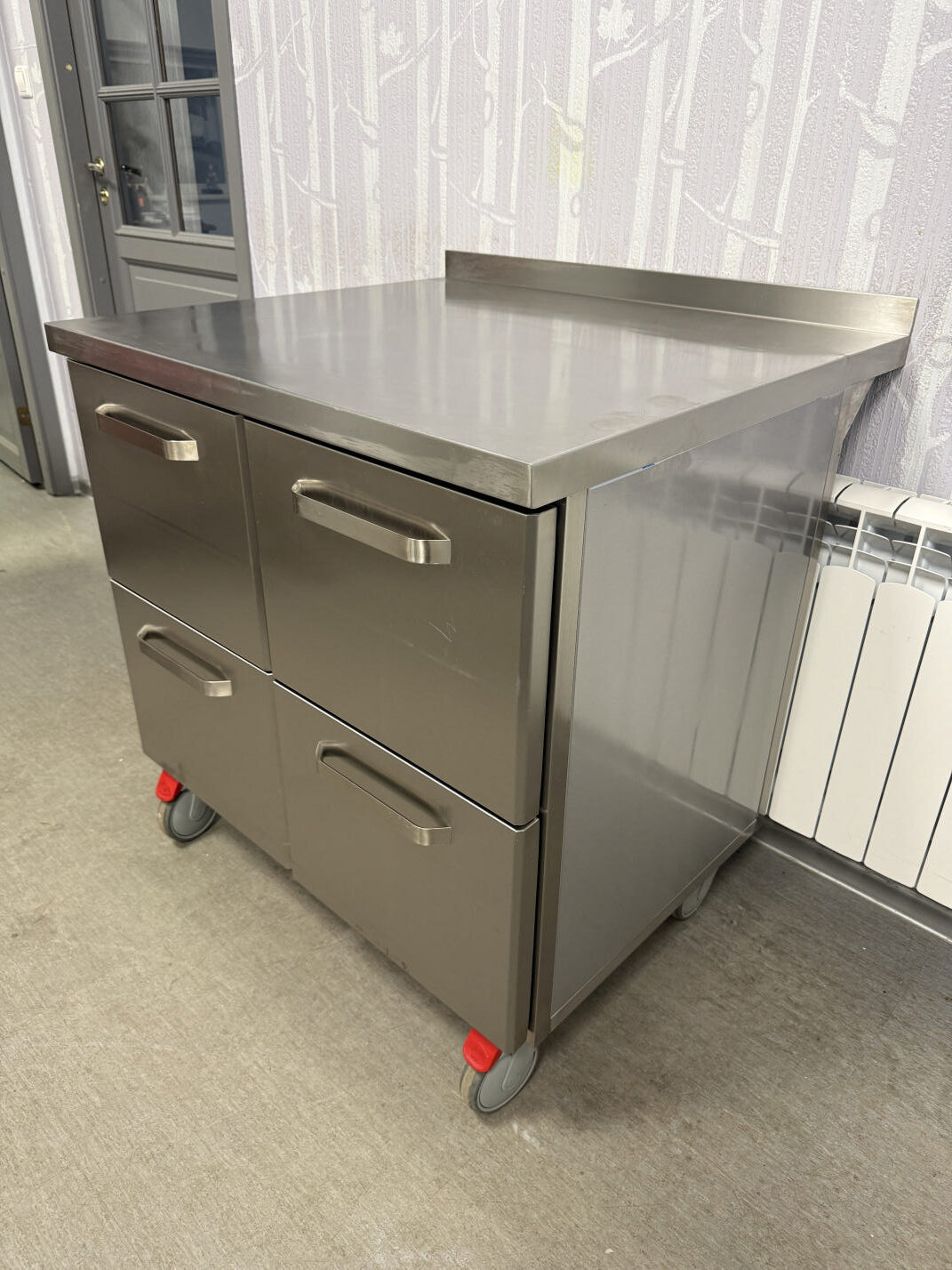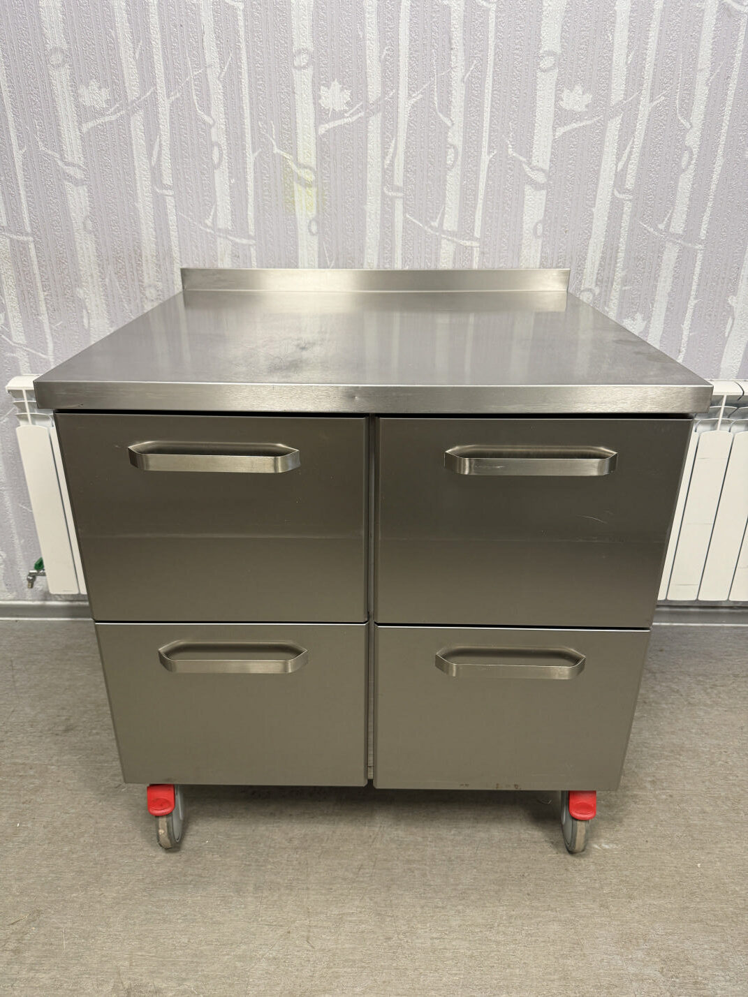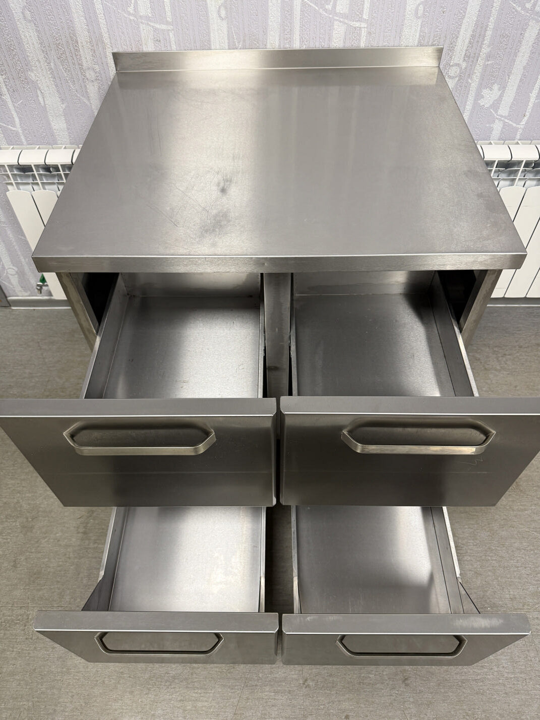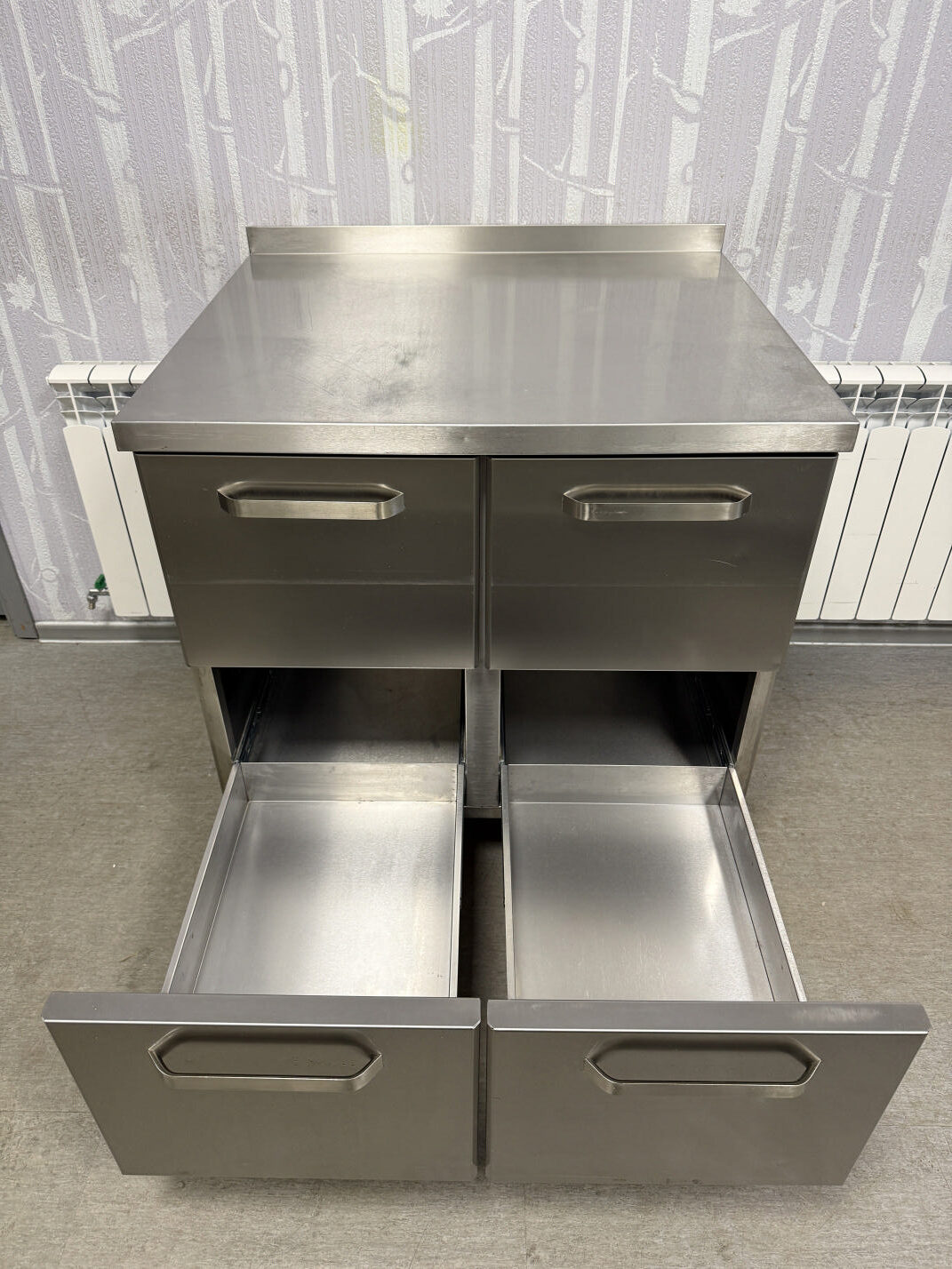 Müüa hästi tugev ja korralik töölaud 4-sahtliga. Valmistatud roostevabast terasest. Sobib ideaalselt ka aluslauaks ahjule, fritüüri, plaatgrilli alla. Karkass tugevast roostevaba nelikant torust ja pealmine plaat väga tugev ja vastupidav. Tagaäär üles 5cm. Kokku 4 suurt sahtlit mõõduga 36x55x31cm. Põhjaks kinnine roosetvaba plaat.