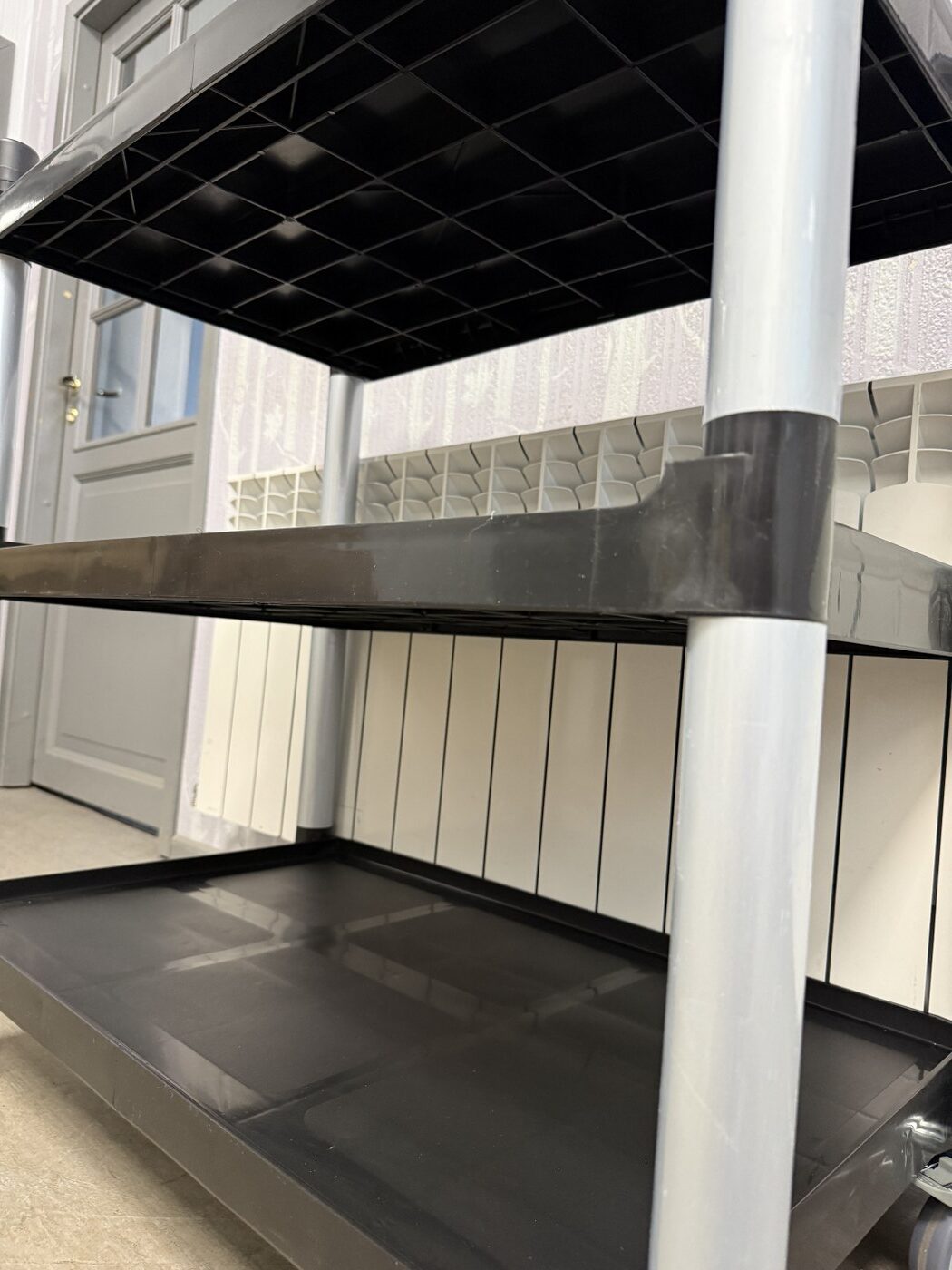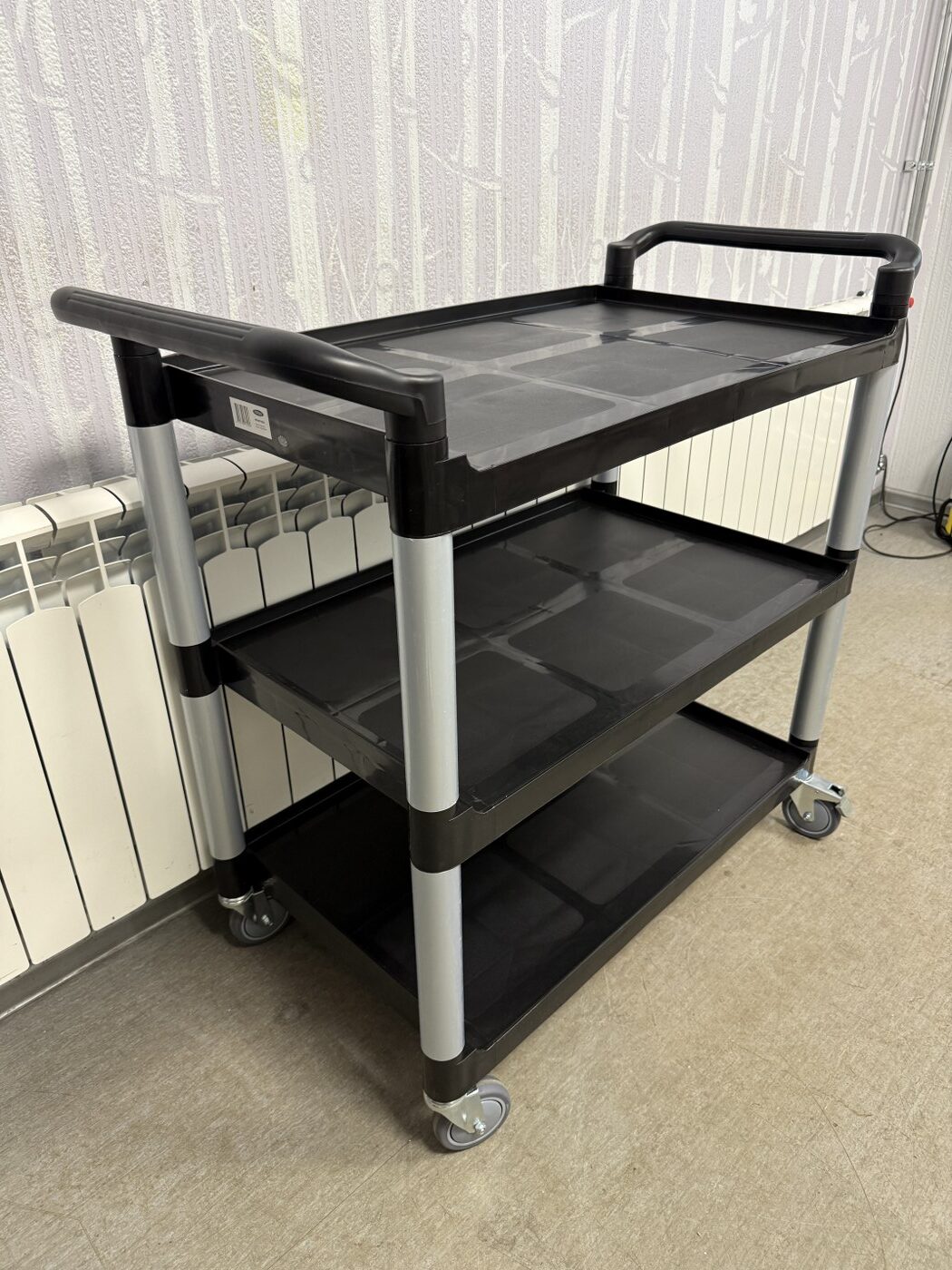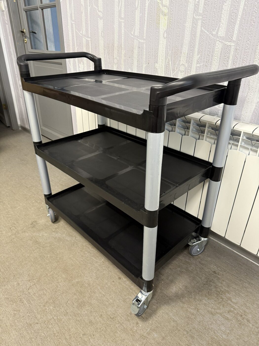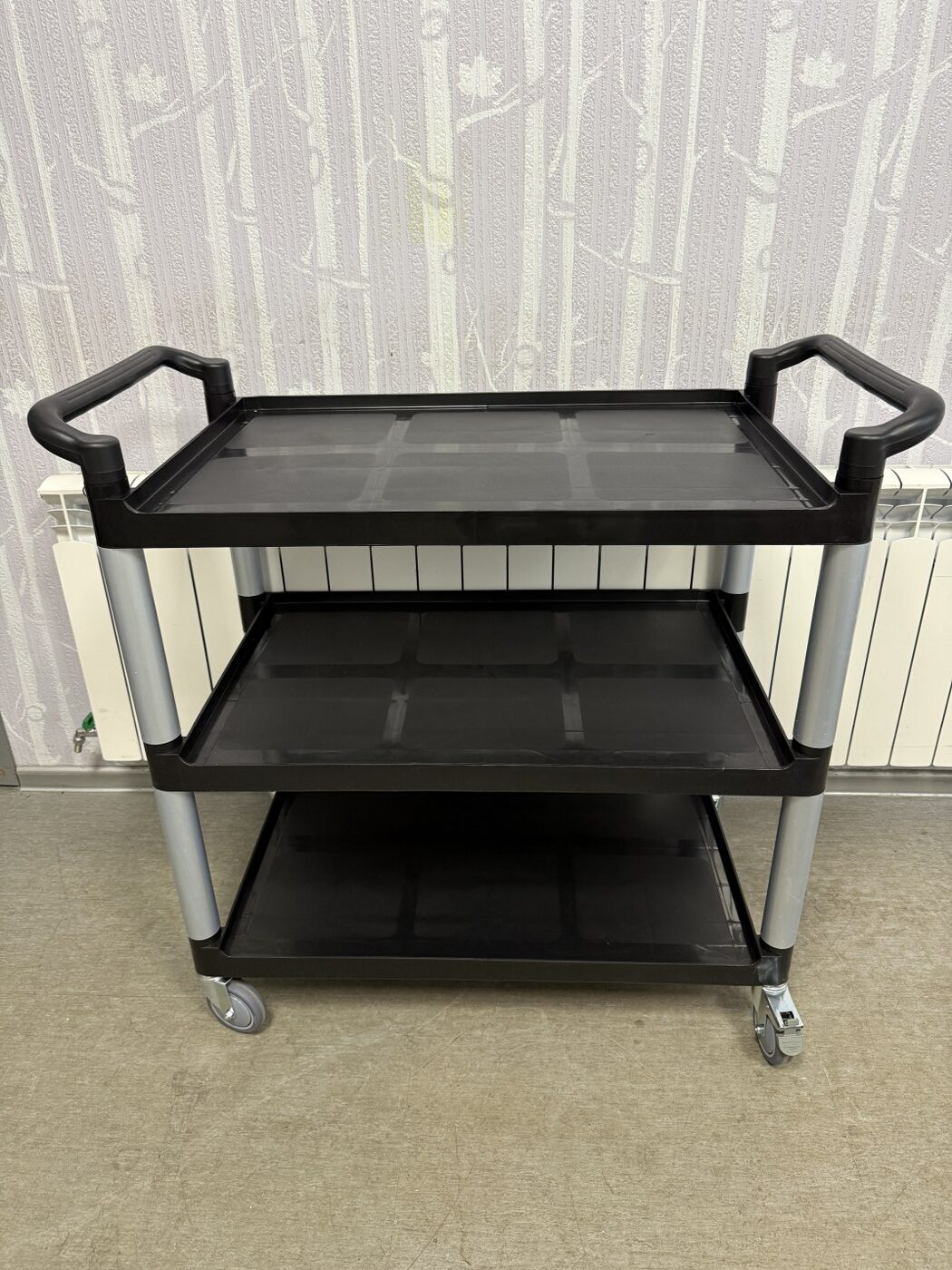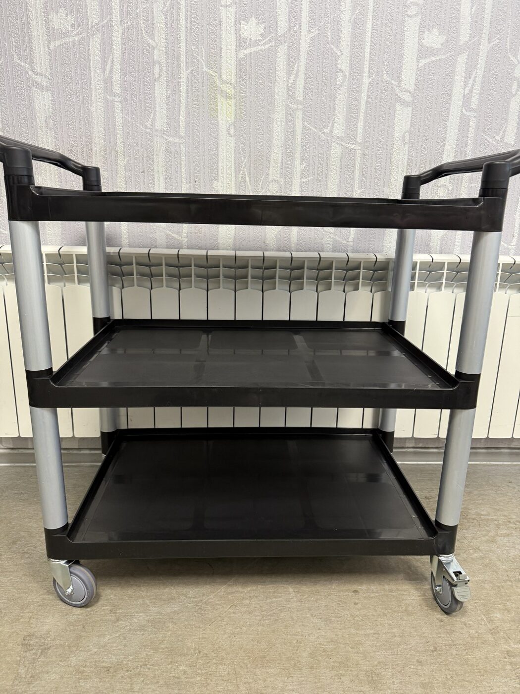 Müüa uus serveerimiskäru. Materjaliks alumiinium konstruktsioon ja plastist riiulid. Kärul on 3 vastupidavat tööpinda, mille kangevõime on 50kg ühe tööpinna kohta. Tööpindadel on kõrgendatud äär, et nõud ei saa maha kukkuda. Nurgad on tugevdatud. All 4 pöörlevat ratast, millest 2 on piduritega. Tööpindade vahe on 30cm. Tööpindade mõõt 79x50cm, äär 2cm. Serveerimiskäru üldmõõdud on 103x50x96cm.