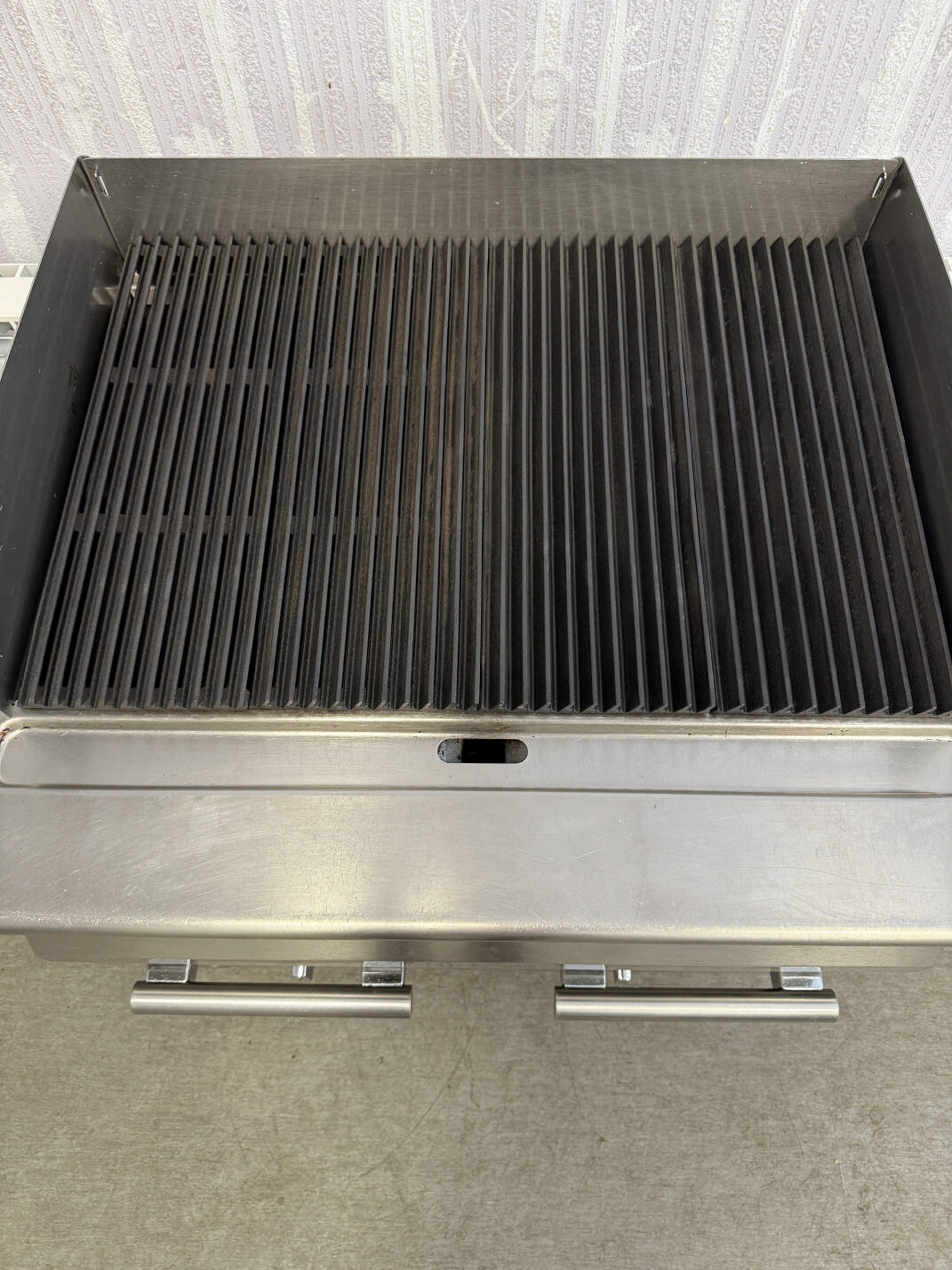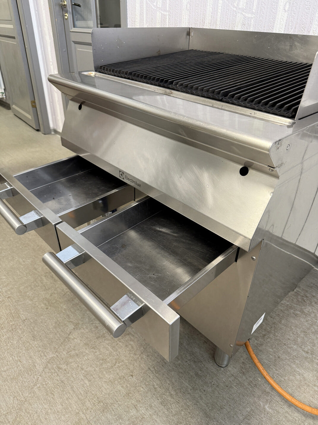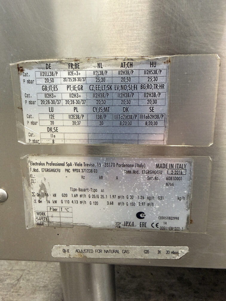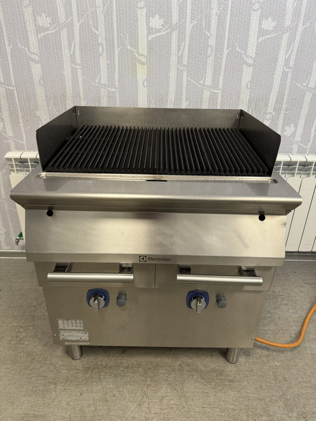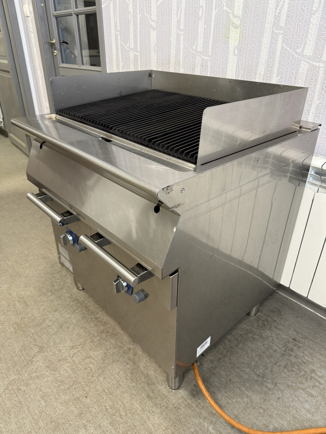 Müüa suur ja mahukas gaasi grill. Suure efektiivsusegaq ja tootlik. Tootja Electrolux. Mudel E7GRGHGCFU. Valmistatud 2016 aasta. Sobib kasutamiseks nii maagaasile kui vedelgaasile. Seadistatud hetkel tsentraal gaasile(G20 düüs 210 tsentraal) . Suur grillimis ala 73x48cm. Malmist küpsetusrestid, puhastamiseks kergesti eemaldatavad. Malmist reste saab kala või liha grillimiseks pöörata. Kaks eraldi kasutatavat ja reguleeritavat tsooni. Mõlema süütamine piezo süütajatega. Kõikidel põletitel kaitsmed et vältida peale tilkumise. Kogu võimsus 16kW ehk eraldi 2x8kW. Peal 4 malmplaati, mis jaotavad ühtlaselt kuumuse. Restid on nurga all, et rasv jookseks otse renni, mitte tule peale. Ees kergesti puhastatav rasvarenn ja kaks suurt vanni kuhu rasv, sodi jookseb. Taga ja külgedel kõrgendused, et ära hoida pritsimise. Piezo süütajad 2tk. Pilootleegi hoidja. Põleti muudab turvaliseks termopaari turvakraan, mis automaatselt sulgeb kraanid, kui peaks kustuma leek. Näiteks peaks vesi sattuma põletile siis termopaar sulgeb kraanid ja rohkem gaasi ei tule. Roostevaba korpus AISI 304. Reguleeritavad jalad. Mõõt 80x73x85-100cm.