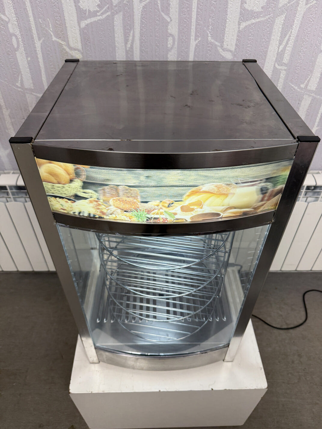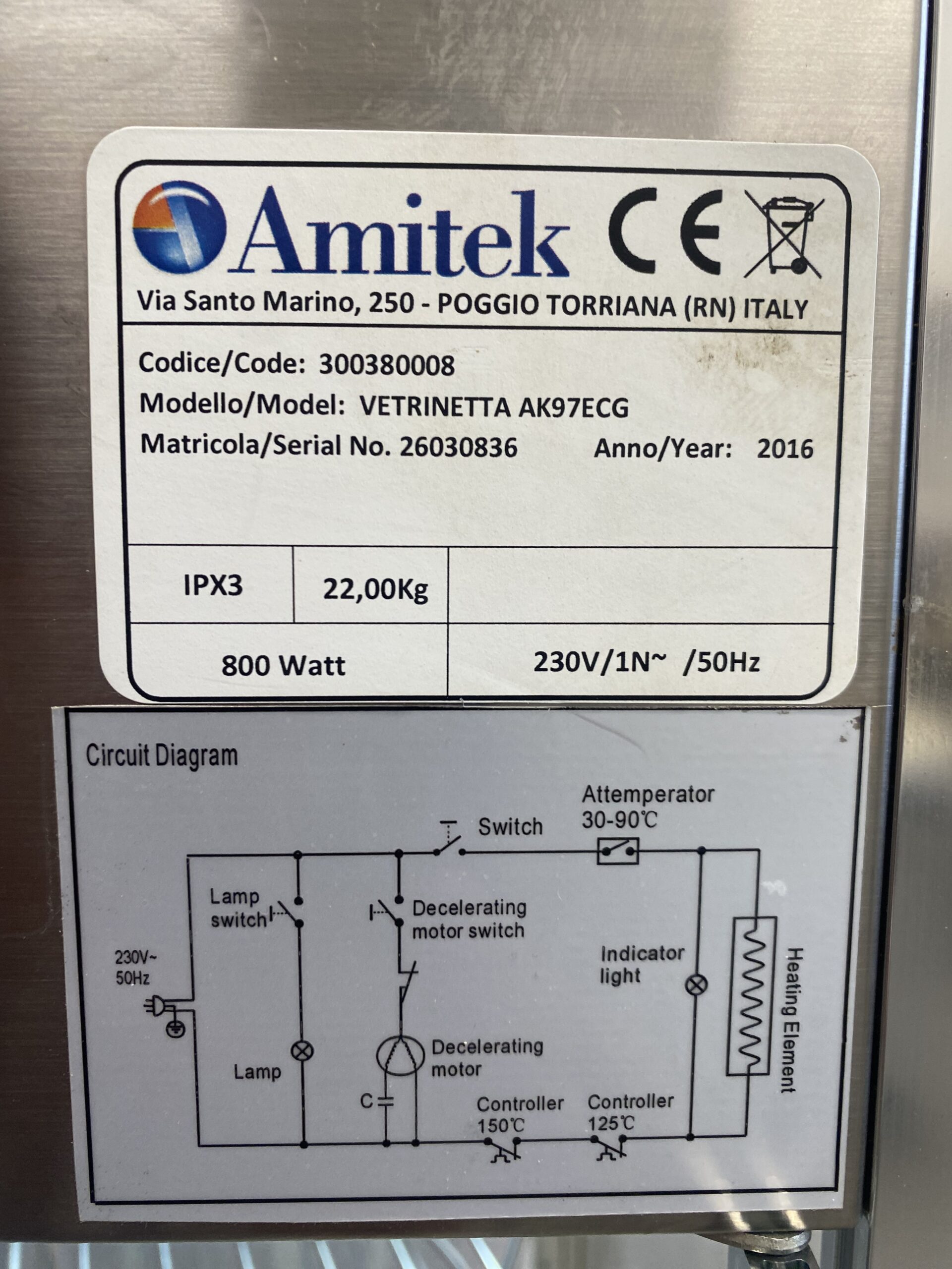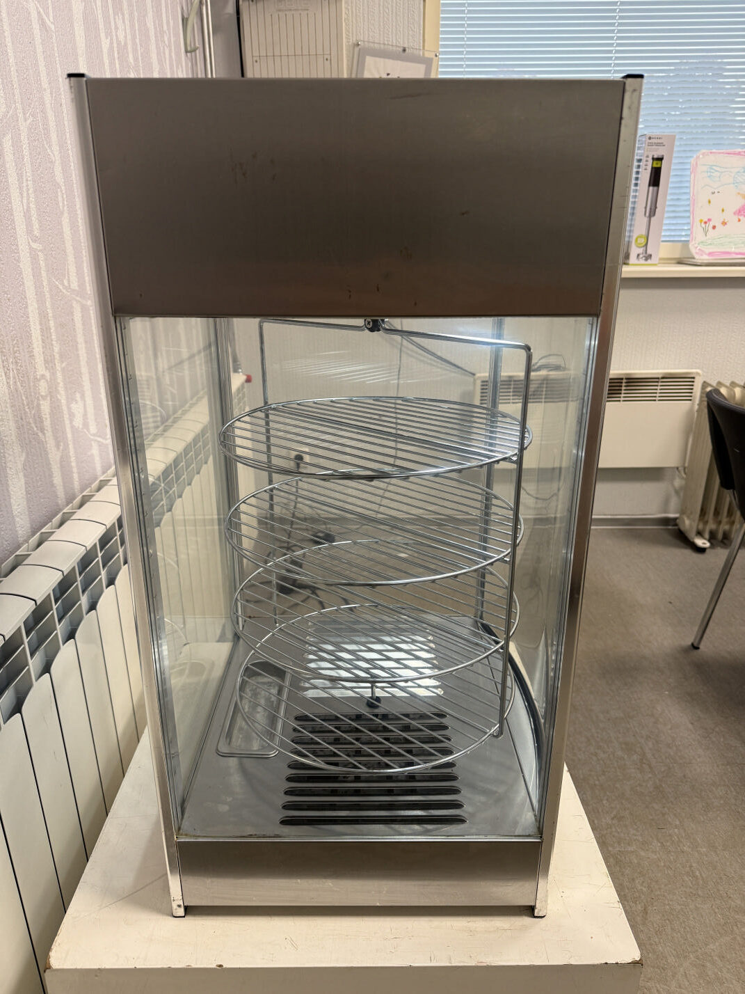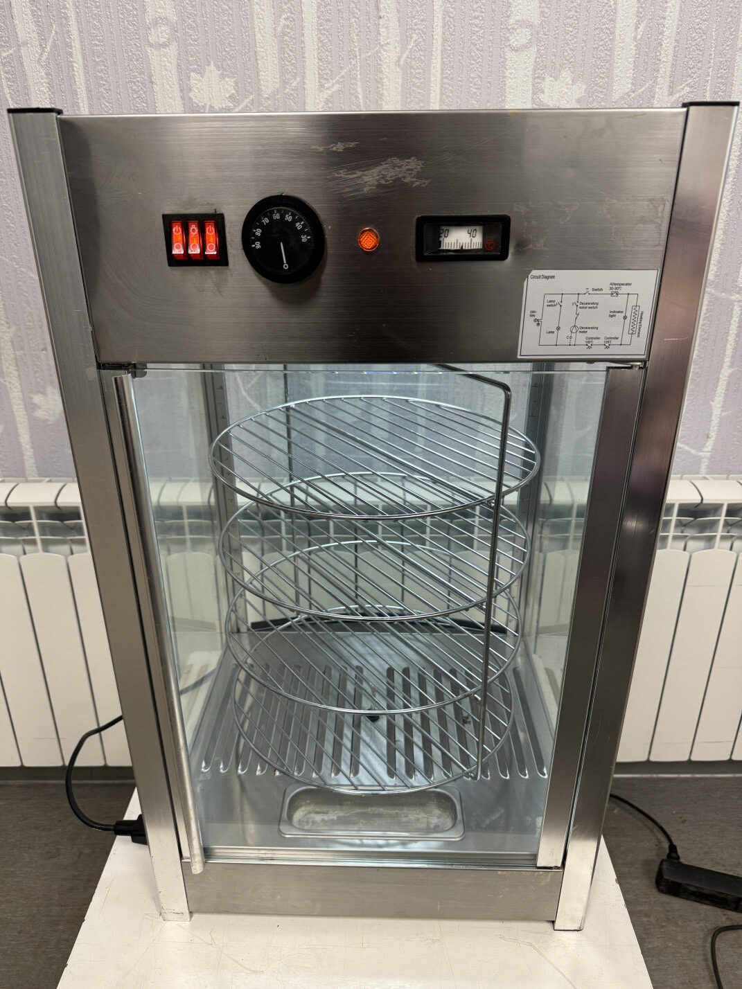 Müüa soe vitriin firmalt Amitek. Mudel Vetrinetta. Sobib ideaalselt pitsa ja muude küpsetiste esitlemiseks. Mõeldud siis pitsade müümiseks tüki kaupa. Ideaalne ja kiire lahendus väliüritustele. Temperatuuri on võimalik reguleerida alates +30C kuni + 90C. All väike vann kuhu võimalik lisada vesi, et lisada niiskust ja hoida ära liigne kuivamine. Sees on pöörlev 4-ne riiul-rest läbimõõduga 35cm. Riiulite vahe 10cm. Riiuleid on lihtne ühe nupuvajutusega panna pöörlema/seisma. Ust avanedes lõpetavad riiulid automaatselt pöörlemise. Vitriinil sees LED valgustus, mida on võimalik nupust sisse-välja lülitada. Kõik küljed on klaasist. Välimuselt esineb kriime, täkkeid ja plekid, nähtav piltidel. Võimsus 800W / 230V. Kaal 22kg.