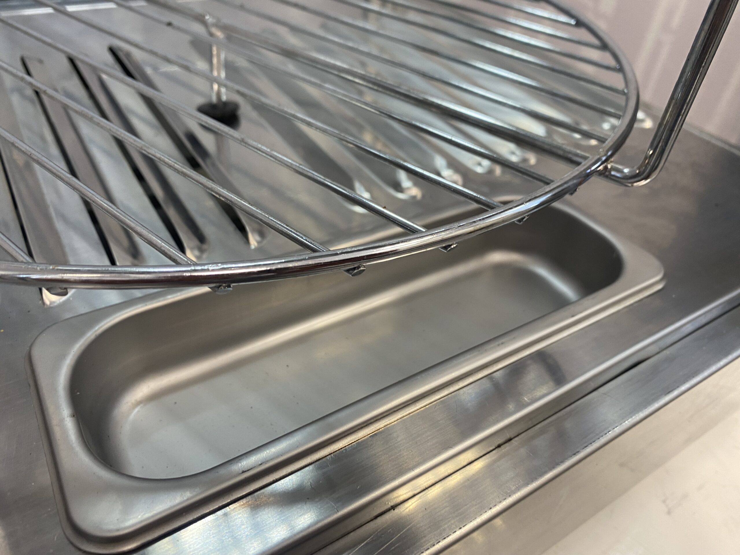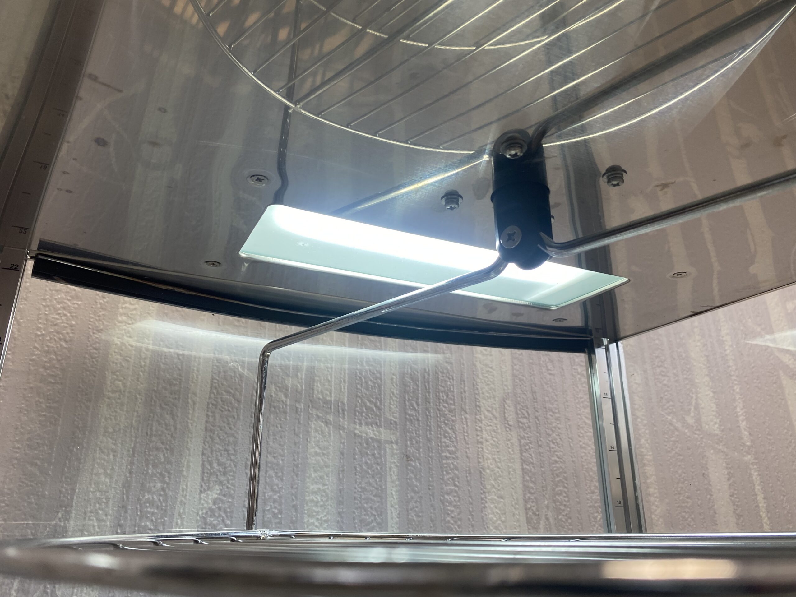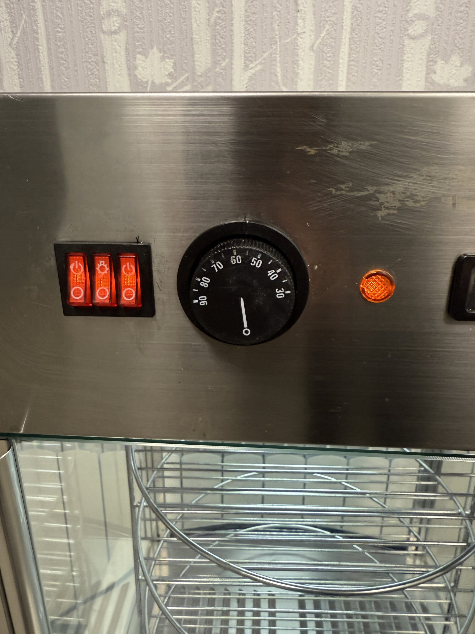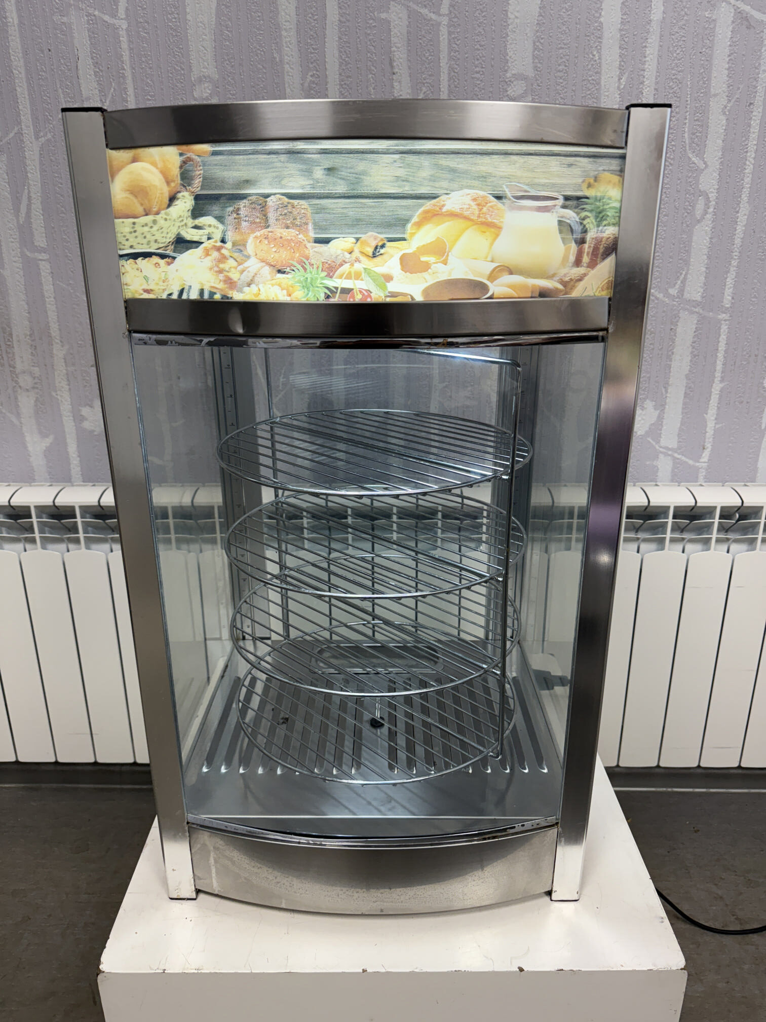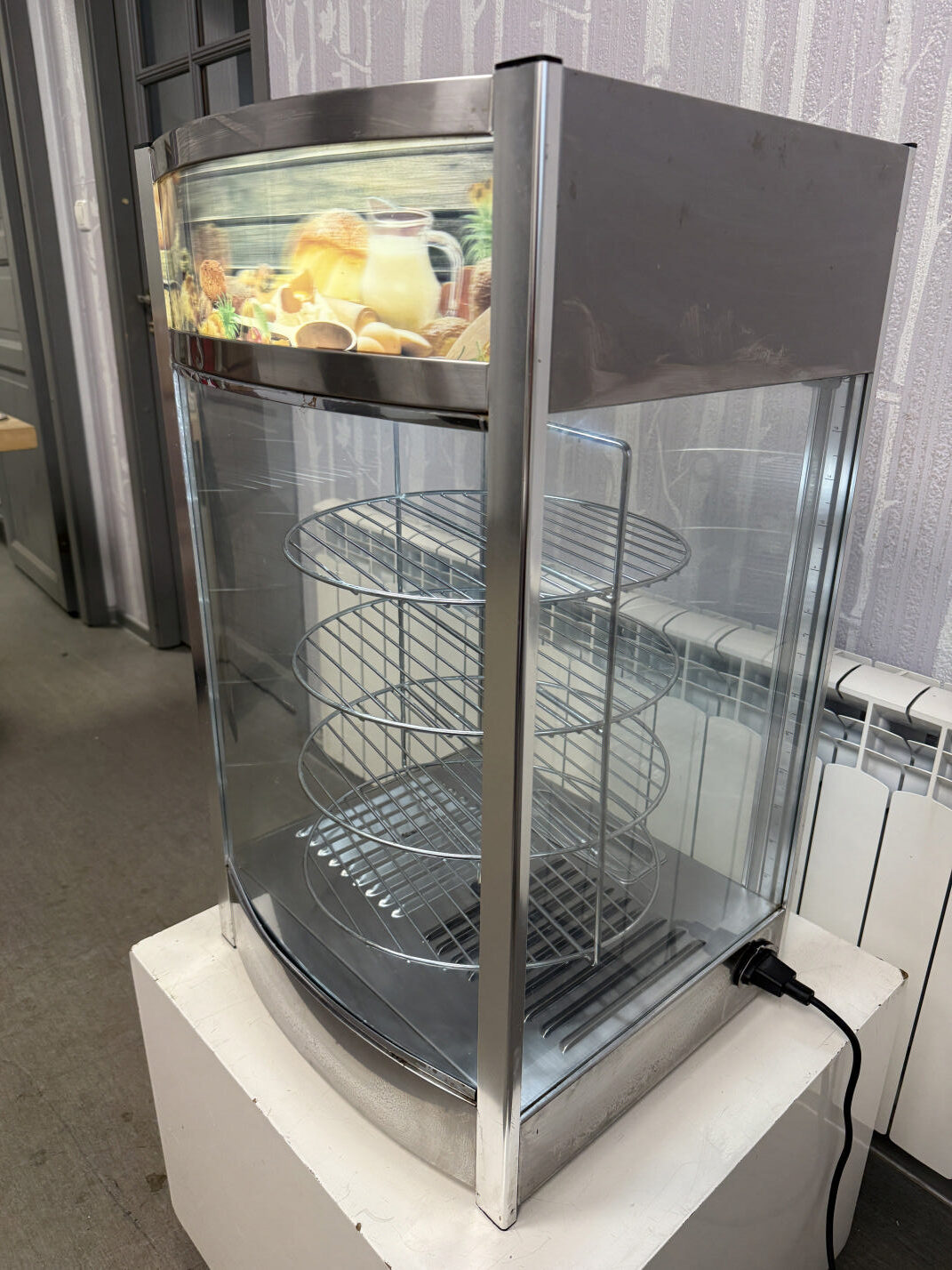 Müüa soe vitriin firmalt Amitek. Mudel Vetrinetta. Sobib ideaalselt pitsa ja muude küpsetiste esitlemiseks. Mõeldud siis pitsade müümiseks tüki kaupa. Ideaalne ja kiire lahendus väliüritustele. Temperatuuri on võimalik reguleerida alates +30C kuni + 90C. All väike vann kuhu võimalik lisada vesi, et lisada niiskust ja hoida ära liigne kuivamine. Sees on pöörlev 4-ne riiul-rest läbimõõduga 35cm. Riiulite vahe 10cm. Riiuleid on lihtne ühe nupuvajutusega panna pöörlema/seisma. Ust avanedes lõpetavad riiulid automaatselt pöörlemise. Vitriinil sees LED valgustus, mida on võimalik nupust sisse-välja lülitada. Kõik küljed on klaasist. Välimuselt esineb kriime, täkkeid ja plekid, nähtav piltidel. Võimsus 800W / 230V. Kaal 22kg.